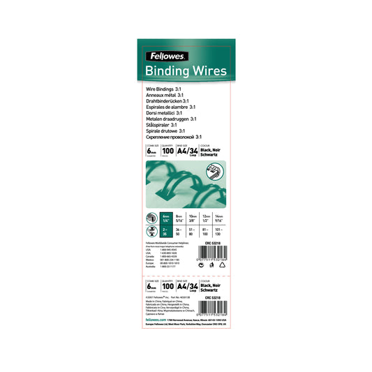 Fellowes Wire Binding Element 6mm Black (Pack of 100) 53218