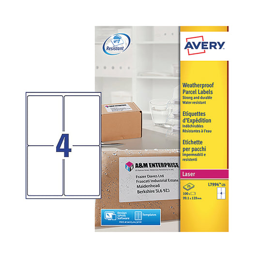 Avery Weatherproof Shipping Label 4 Per Sheet (Pack of 100) L7994-25