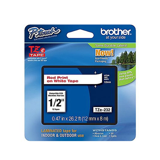 Brother P-Touch TZe Laminated Tape Cassette 12mm x 8m Red on White Tape TZE232