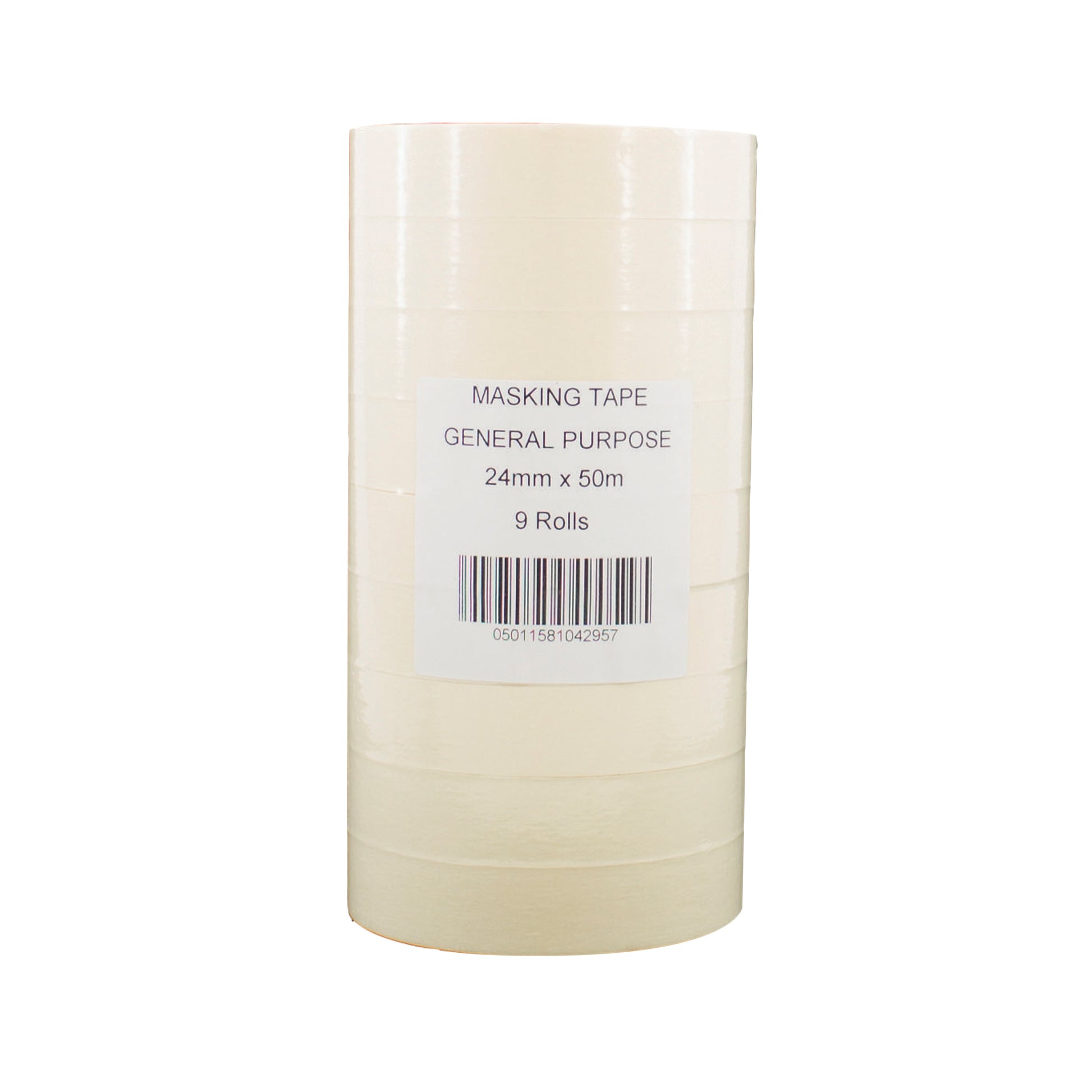 White masking tape for decoration and painting. Easy to remove. Leaves no unwanted marks. 25mmx50m. Pack of 9 rolls.