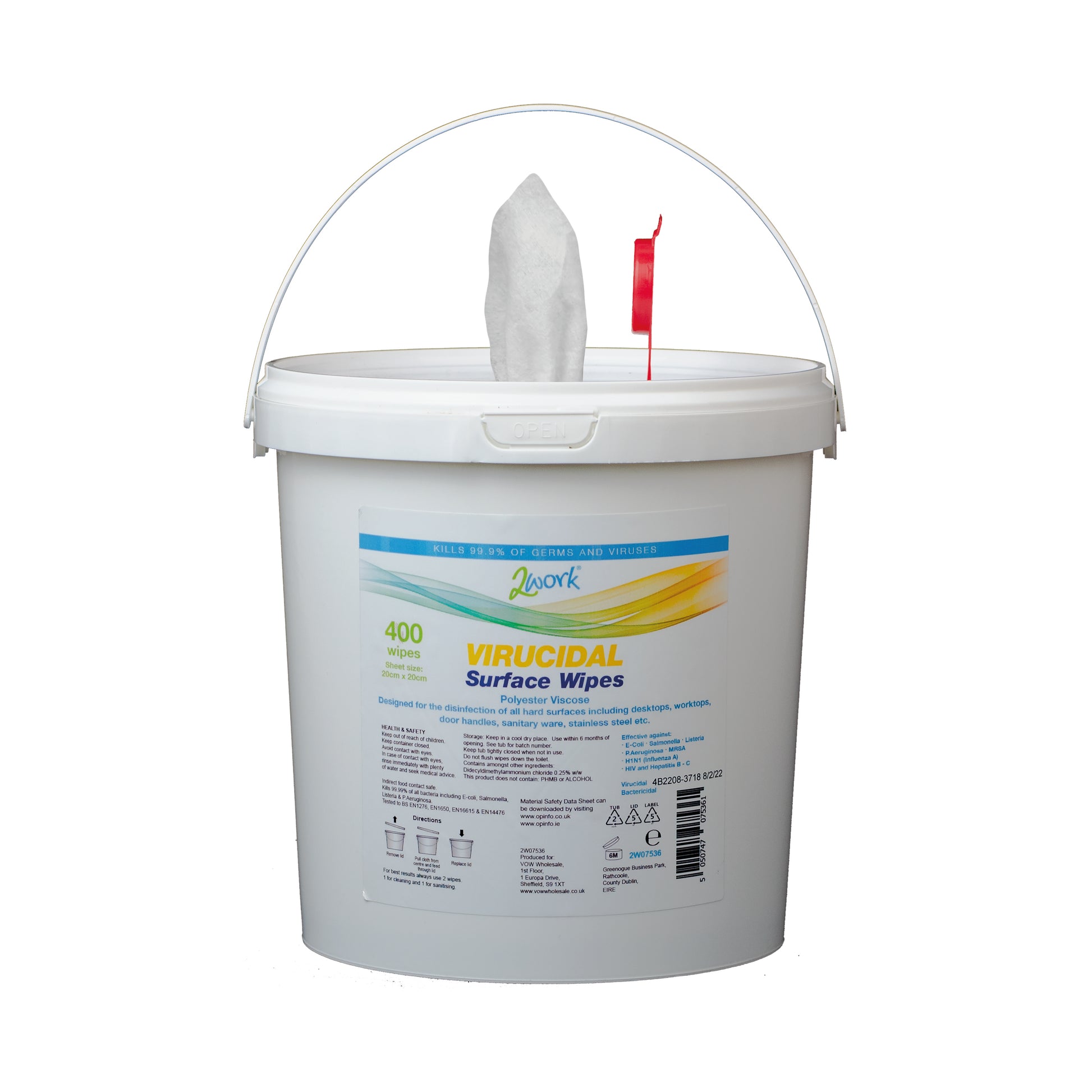 2Work Disinfectant Virucidal Multi Surface Wipes (Pack of 400) 2W07536. Virucidal and antibacterial surface wipes. Kills 99.999% bacteria. Alcohol free formulation. Conforms to: EN1276, EN14476 and EN1650. Each wipe measures: 140 x 200mm.