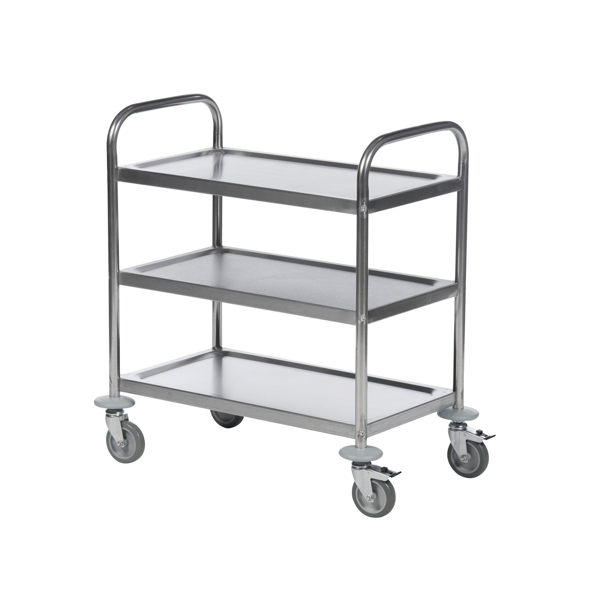 With pressed stainless steel shelves. Four 100mm diameter rubber tyred swivel castors. Capacity 100kg. Supplied in knock down form for easy assembly on site. Three shelves. L860 x W530 x H810mm. Non returnable.