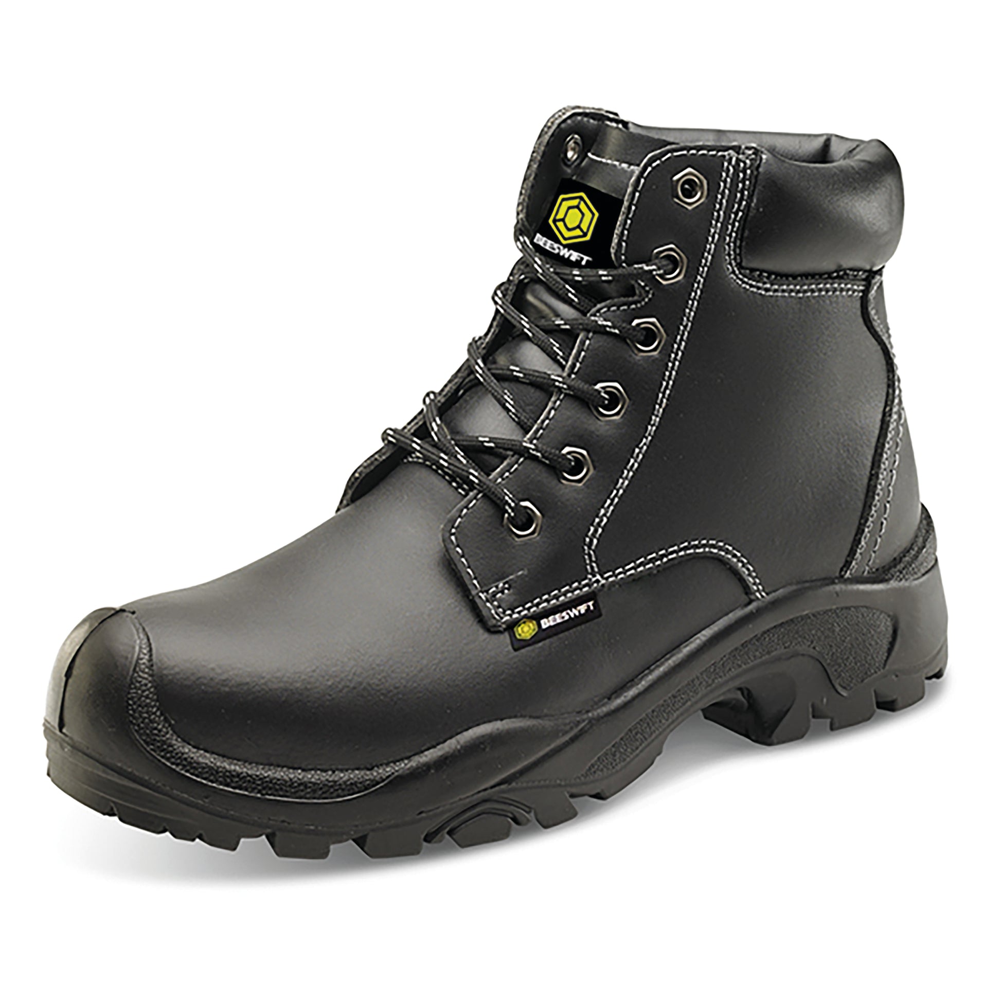 Beeswift 6 Eyelet PUR S3 Boot. 200 Joule steel toe cap. Steel midsole protection. Shock absorber heel. Anti-static. Oil resistant sole. Slip resistant. Water resistant leather upper. Honeycomb gel heel insole. Conforms to EN ISO 20345:2011 S3 SRC HRO.