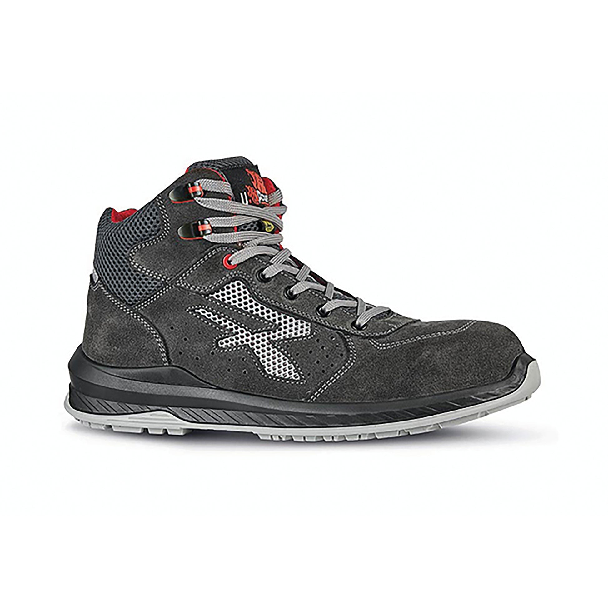 U.Power Alicante high cut safety boot. Composite toe cap. Arched insole structure with an anti-fatigue insert. Oil/slip resistant outsole. Abrasion resistant and anti-static PU outsole. Lace up, breathable suede leather with mesh inserts uppers. 1 pair.