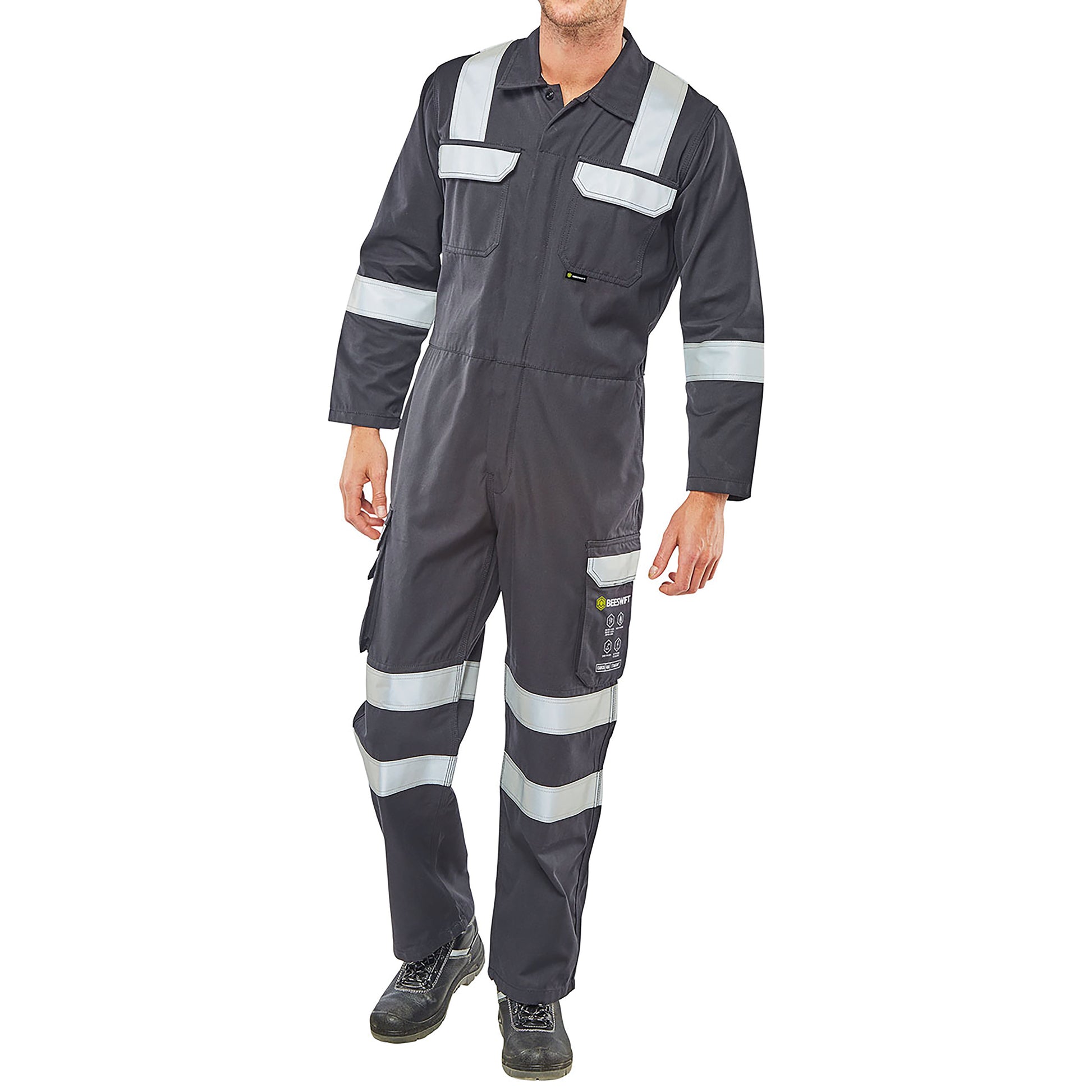 Beeswift ARC Flash Coverall. Fire retardant, Hi Vis, anti-static, Arc Flash protection Coverall. 300gsm 60% Modacrylic and 40% cotton blend. Pockets with retro-reflective tape feature. Internal knee pad pouches. Triple stitch construction.