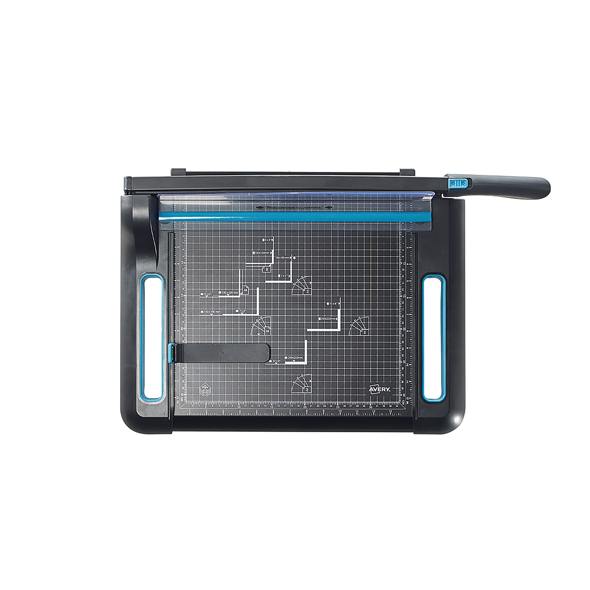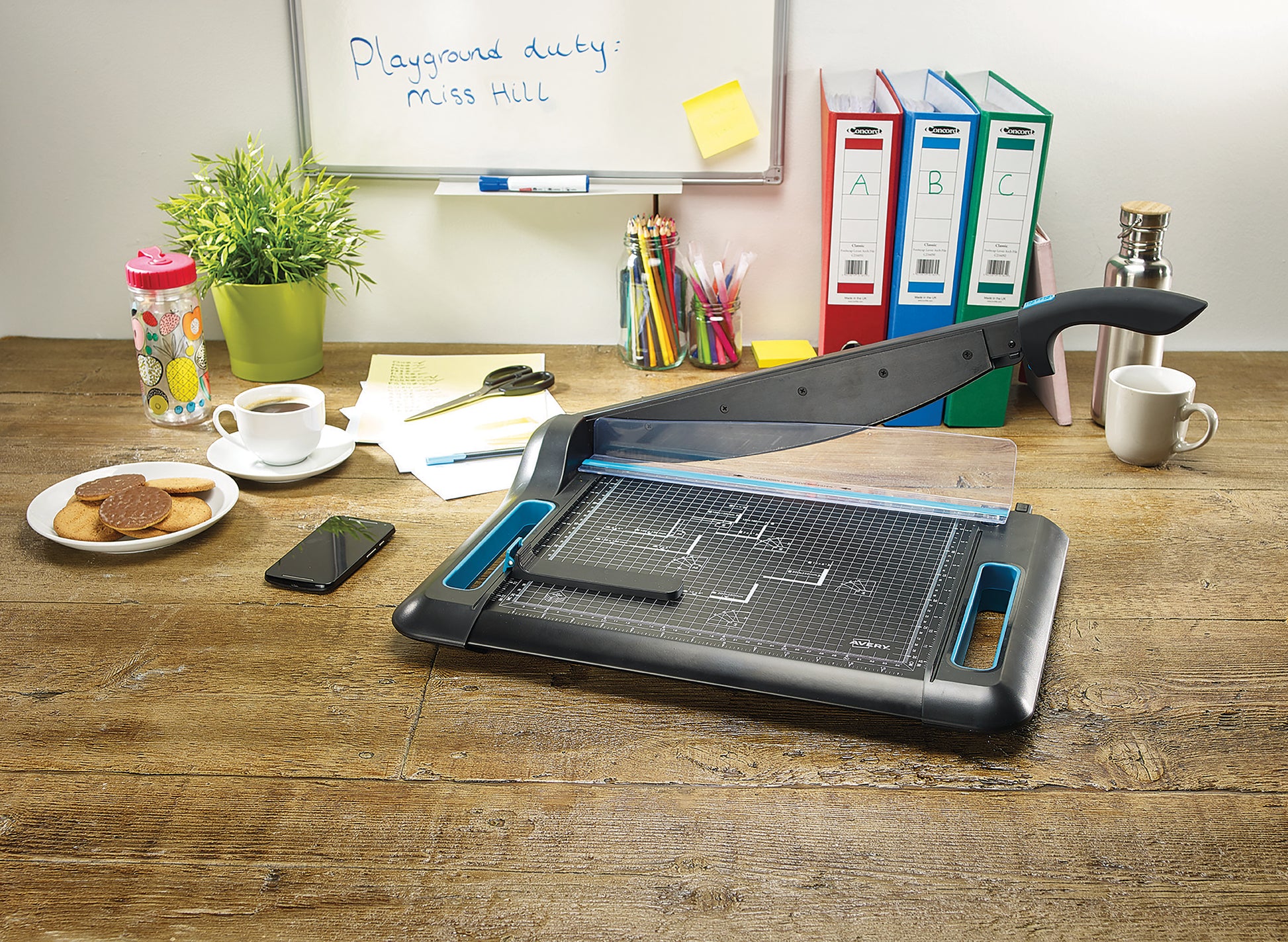 Heavy duty guillotine for effortless cutting of large volumes of paper. Features include self sharpening stainless steel blade. Locking mechanism which automatically locks the blade down. Steel baseboard printed with mm inches and photographic sizes. A4.