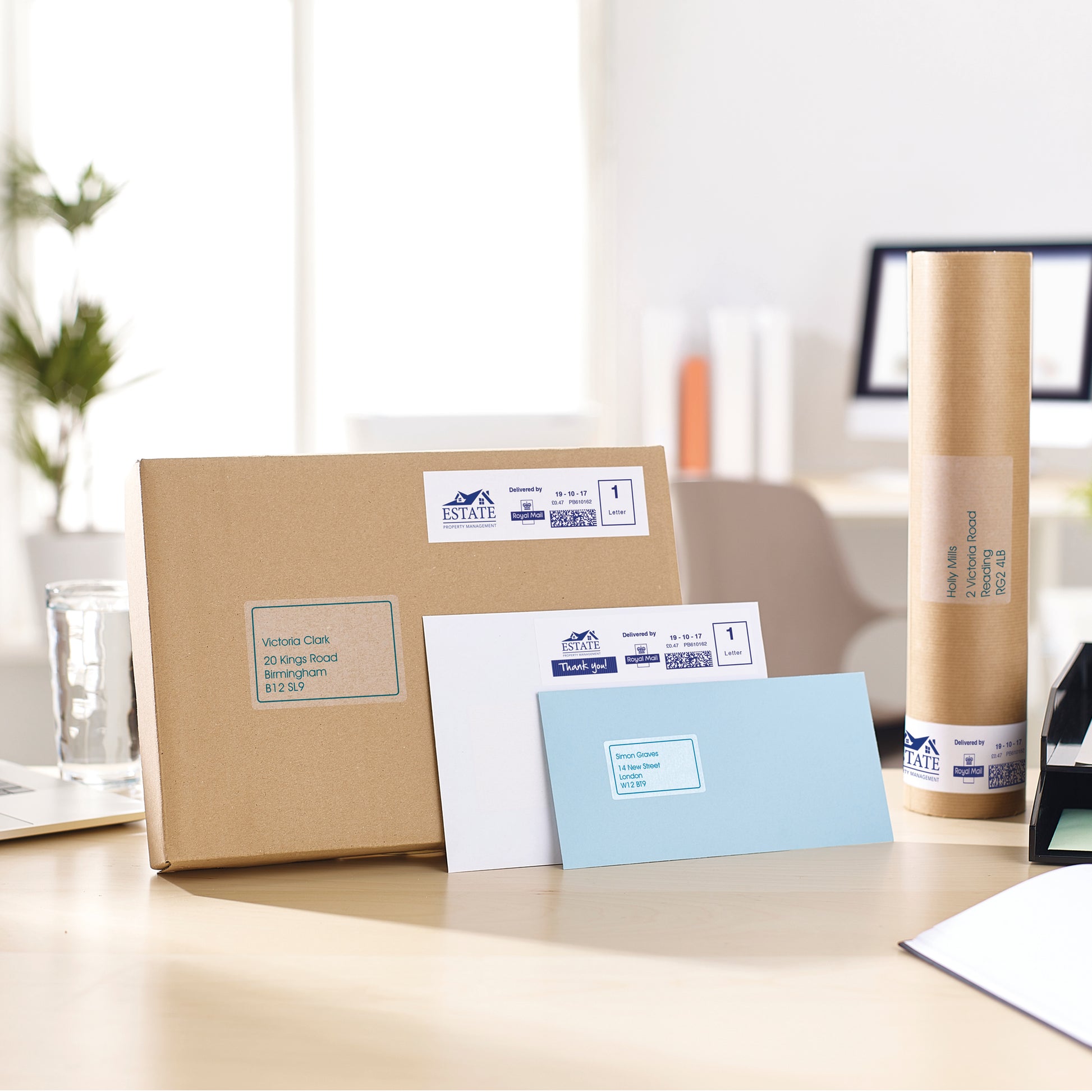 Avery Clear laser labels virtually disappear when applied to White of coloured background. Ideal for use on coloured envelopes. Gives an individual typed effect. 99.1x38.1mm 14 labels per sheet 25 sheets per pack. L7563.