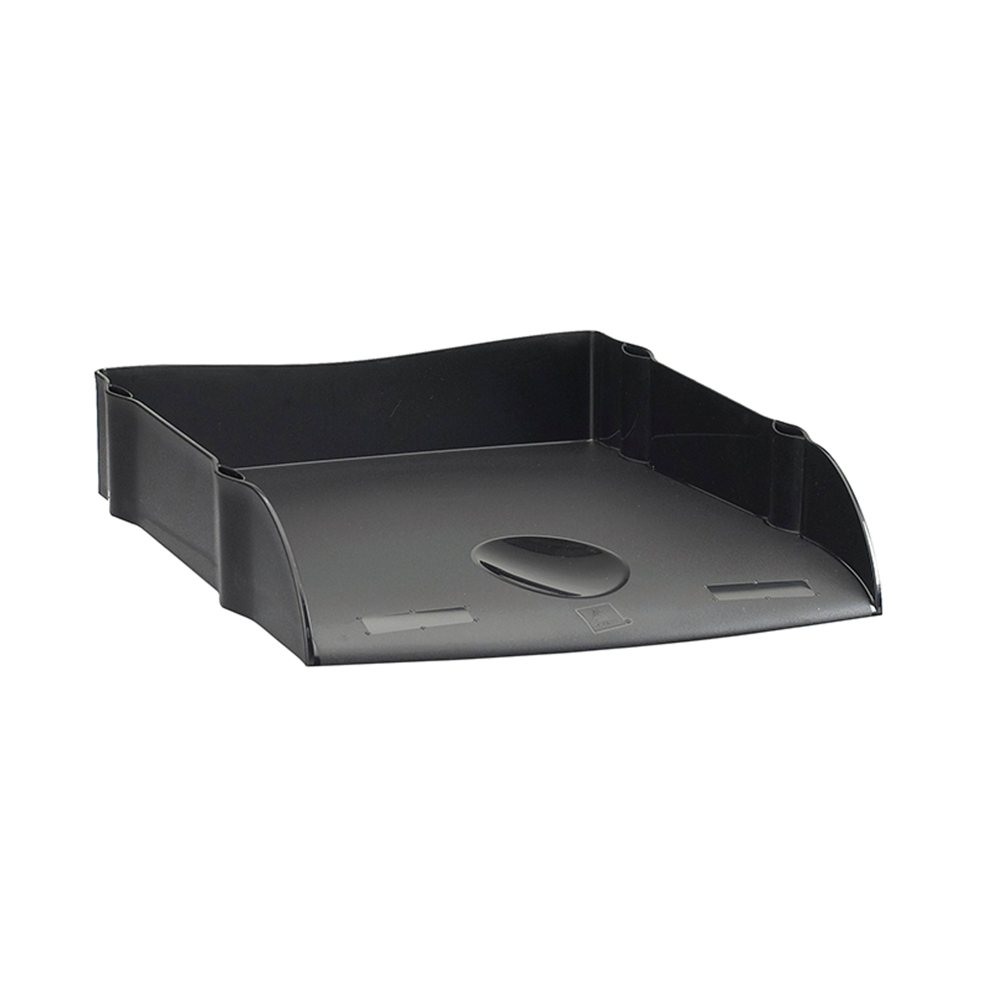 Avery Desktop Letter Tray. Angled base for easy retrieval of papers. Made from 100% recycled plastic. Scooped front for easy access. Multiple stacking solutions with risers (available separately). Colour - Black.