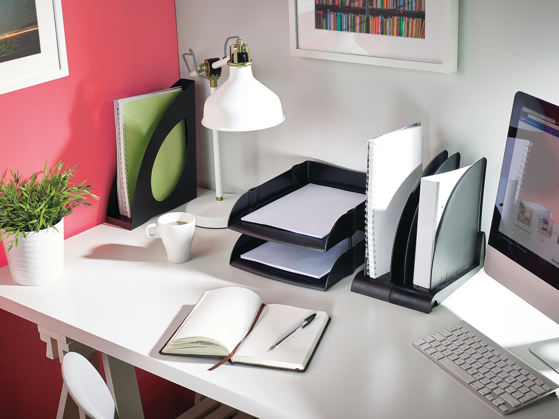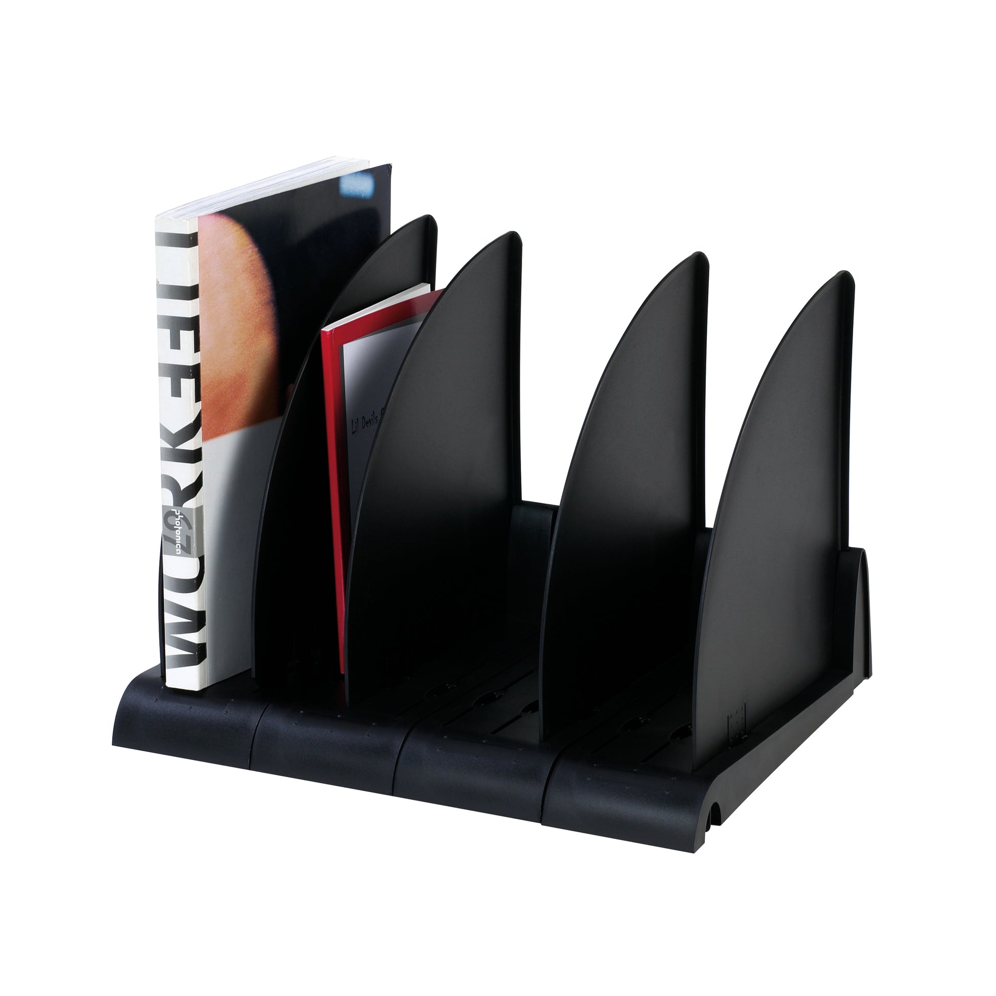 Avery Desktop Book Rack. Sturdy heavy-duty book rack with angled base to ensure books and files do not tip out. Solid dividers can be moved to form different sized compartment widths. Additional racks can be added. Colour - Black.