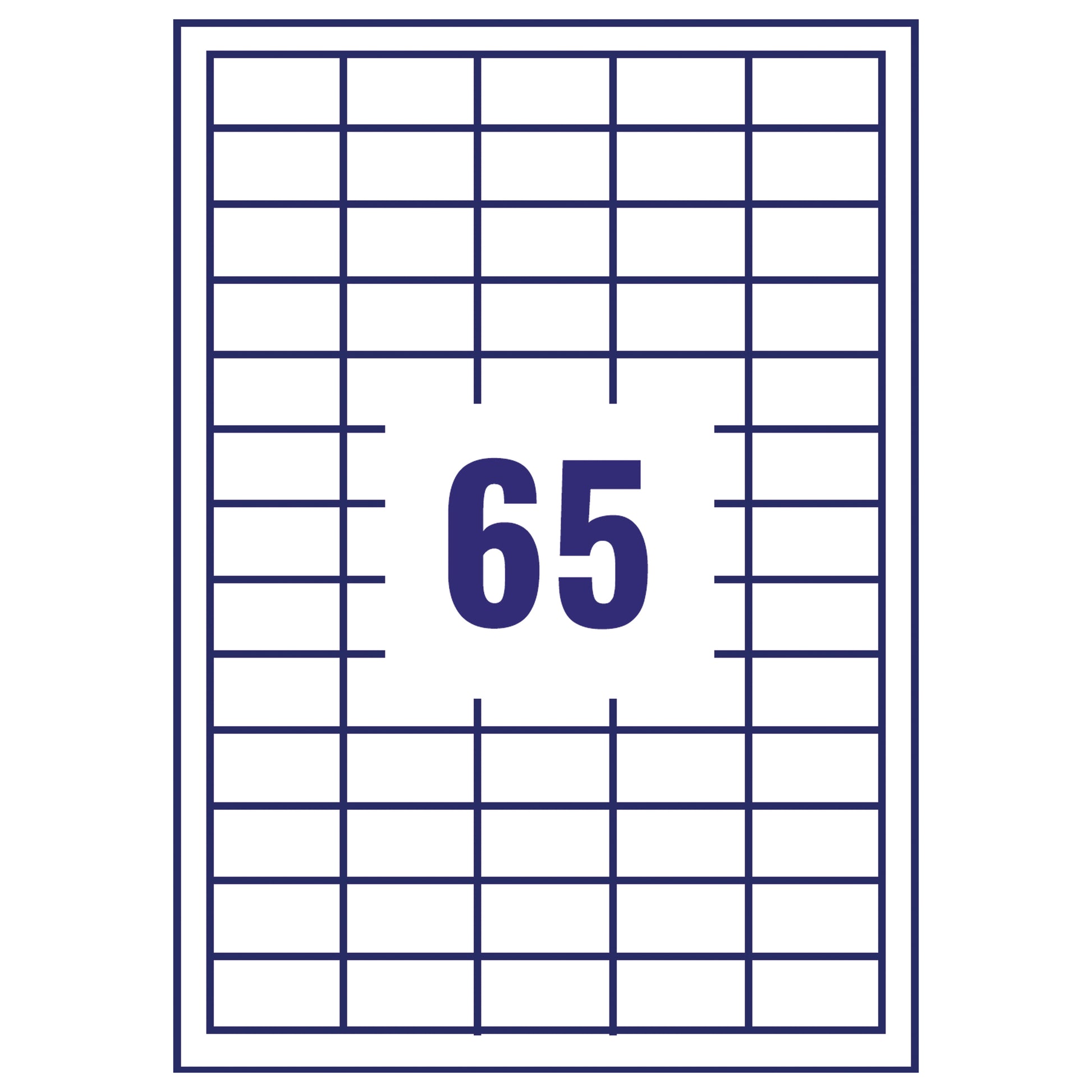 Avery Ultragrip Multipurpose Labels. Compatible with most laser and inkjet printers, including multifunctional devices and photocopiers. Pack contains 100 A4 sheets with 65 labels per sheet (6500 labels in total). Size: 38.1x21.2mm. Colour: White.