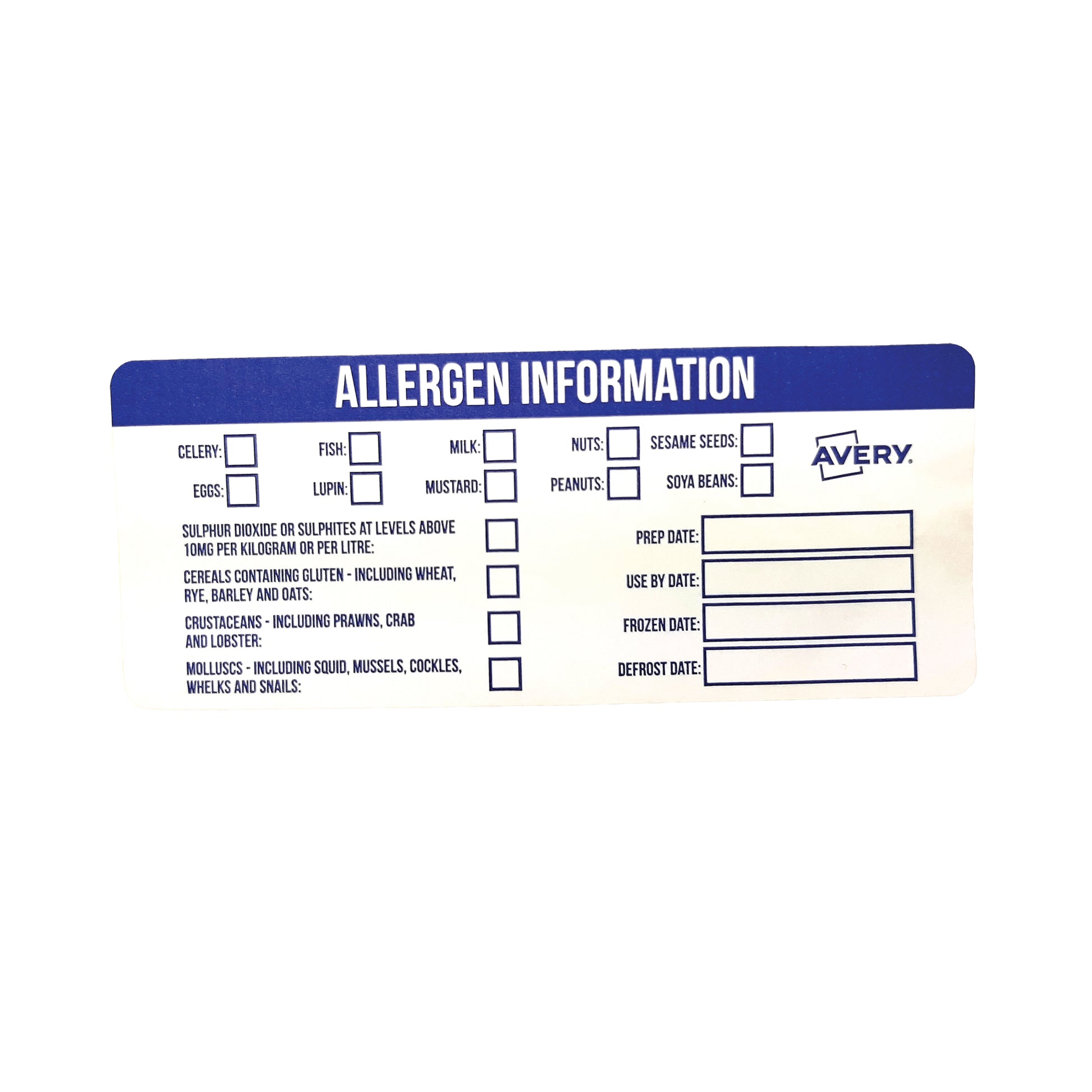 Avery Pre-Printed Allergen Food Labels 98x40mm Pack of 300 ALL9840. Handwrite on the label. Adheres perfectly and removes easily without leaving any residue. Label Size: 98 x 40mm. Pack of 300 labels.