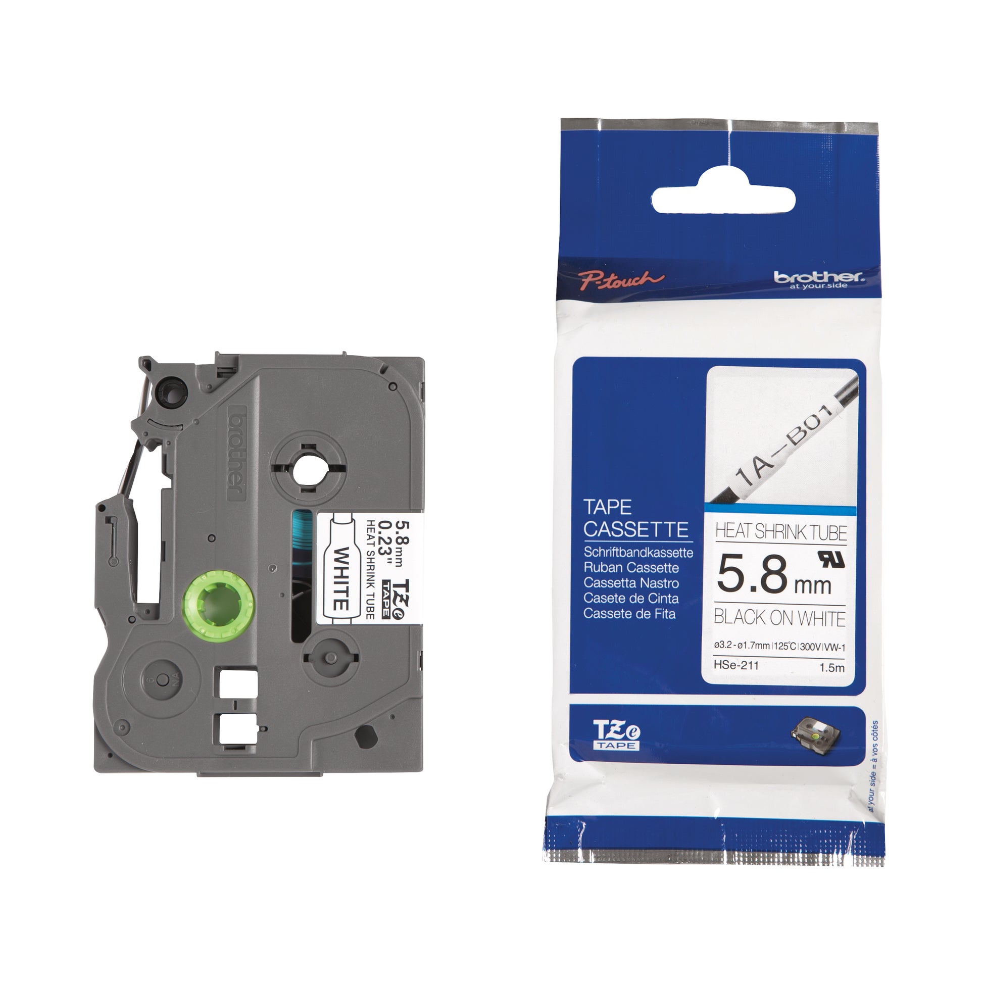 Brother HSe Label Tape 5.8mm x 1.5m Heat Shrink Black on White HSE211. For with Brother P-touch label printers. Self-adhesive heat shrink tube labelling tape. Use a heat gun to shrink the tube to the cable tightly. Shrink ratio of 2:1. WxL: 5.8mm x 1.5m.