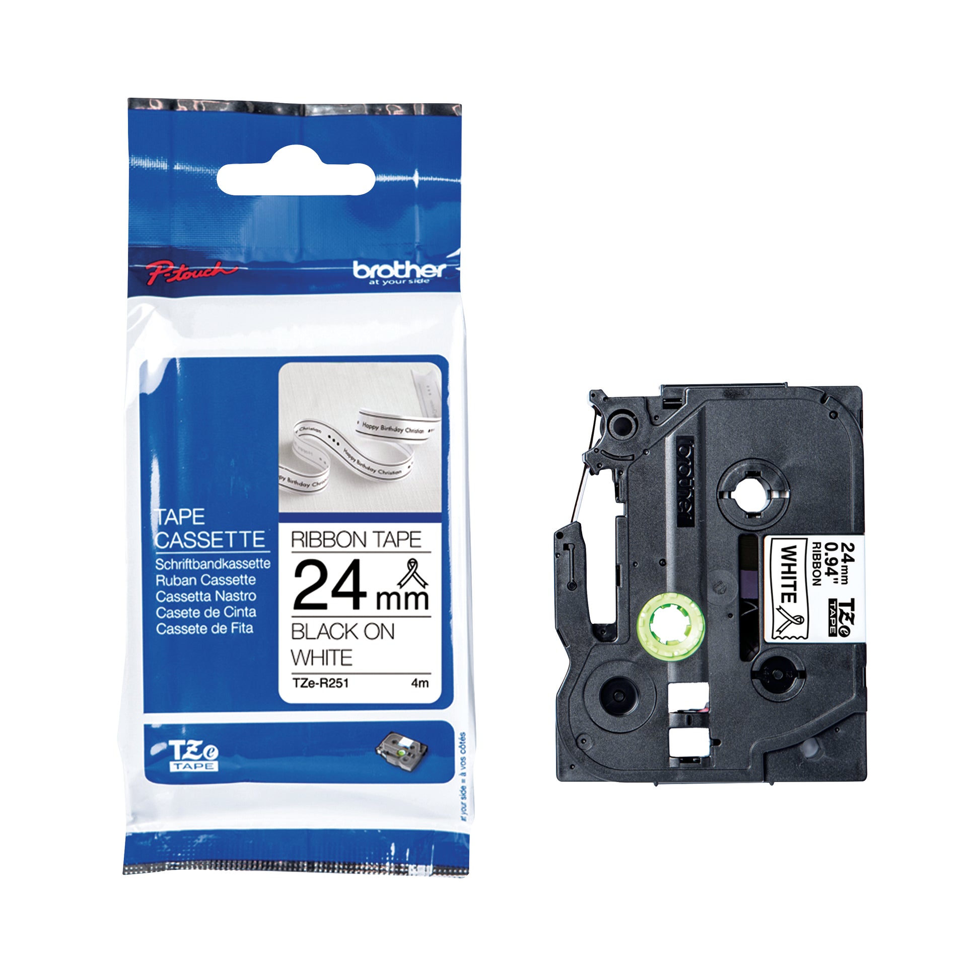 Brother TZe P-T Labelling Ribbon Tape 24mm x 4m Black on White TZER251. Compatible with Brother P-touch label printers. Fabric ribbon with a luxury shiny finish. Perfect for present wrapping and craft. WxL: 24mm x 4m.