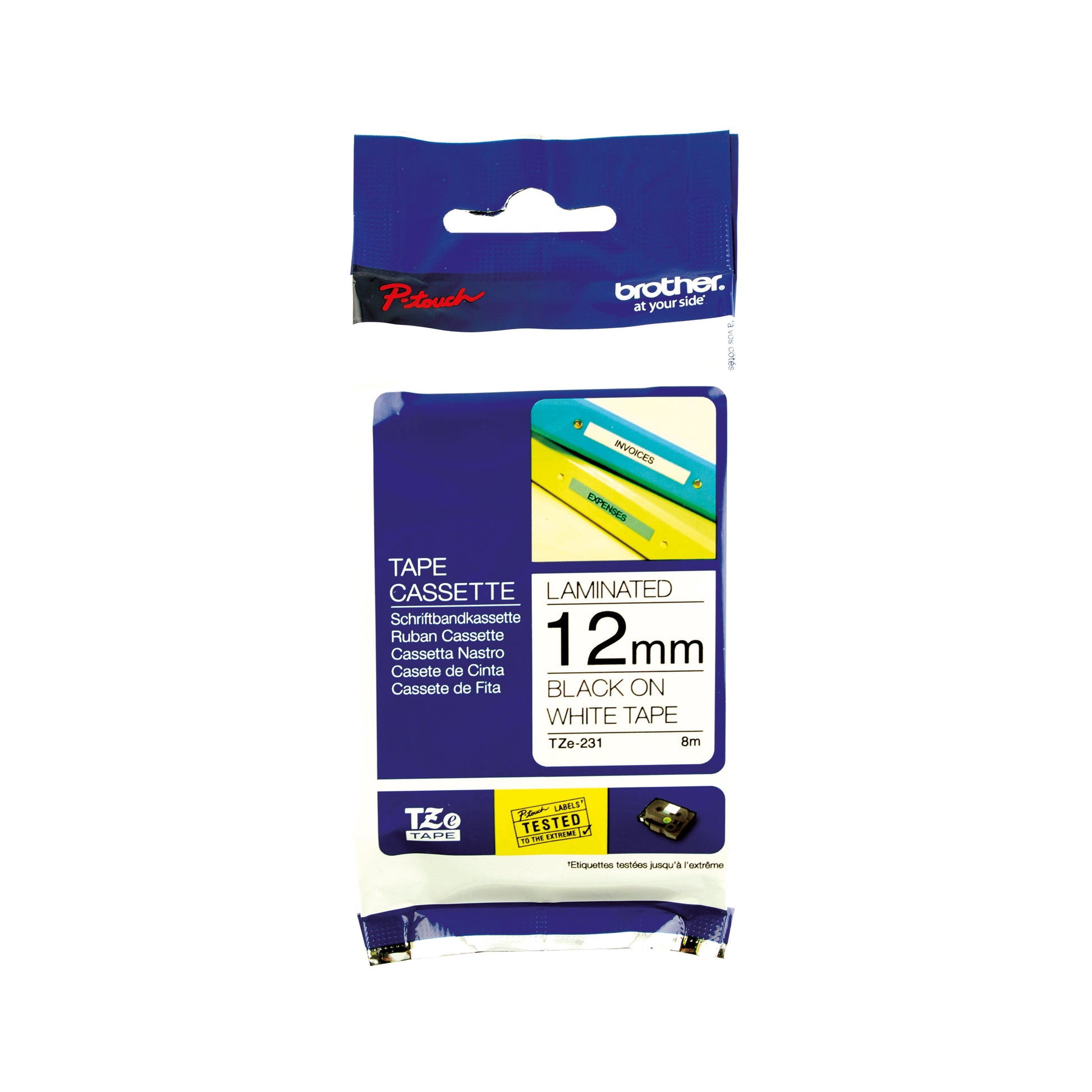 A laminate film on the tape protects text and colours from all kinds of agents such as chemicals abrasives etc. commonly found in industrial environments. Tape is waterproof and extremely temperature resistant. P-touch tape TZ-231 12mmx8m Black on White.