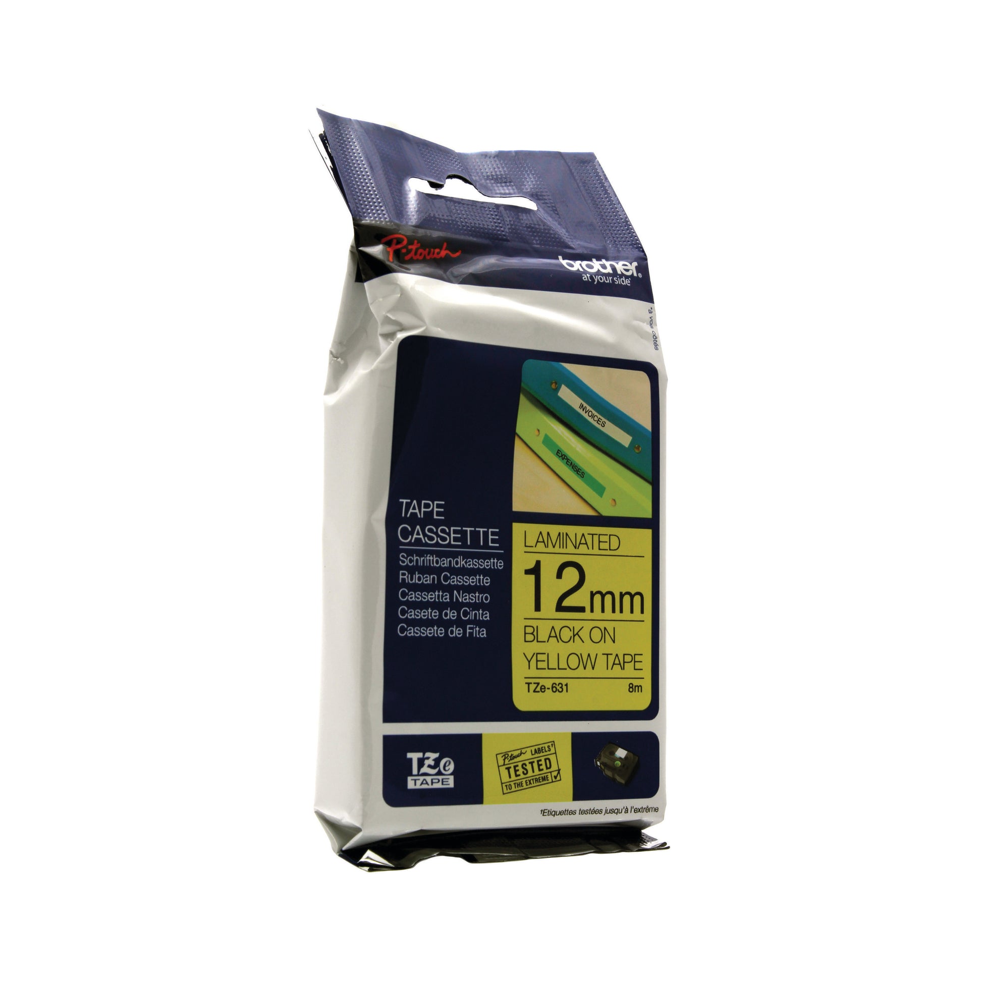 A laminate film on the tape protects text and colours from all kinds of agents such as chemicals abrasives etc. commonly found in industrial environments. Tape is waterproof and extremely temperature resistant. P-touch tape TZ-631 12mmx8m Black on Yellow.