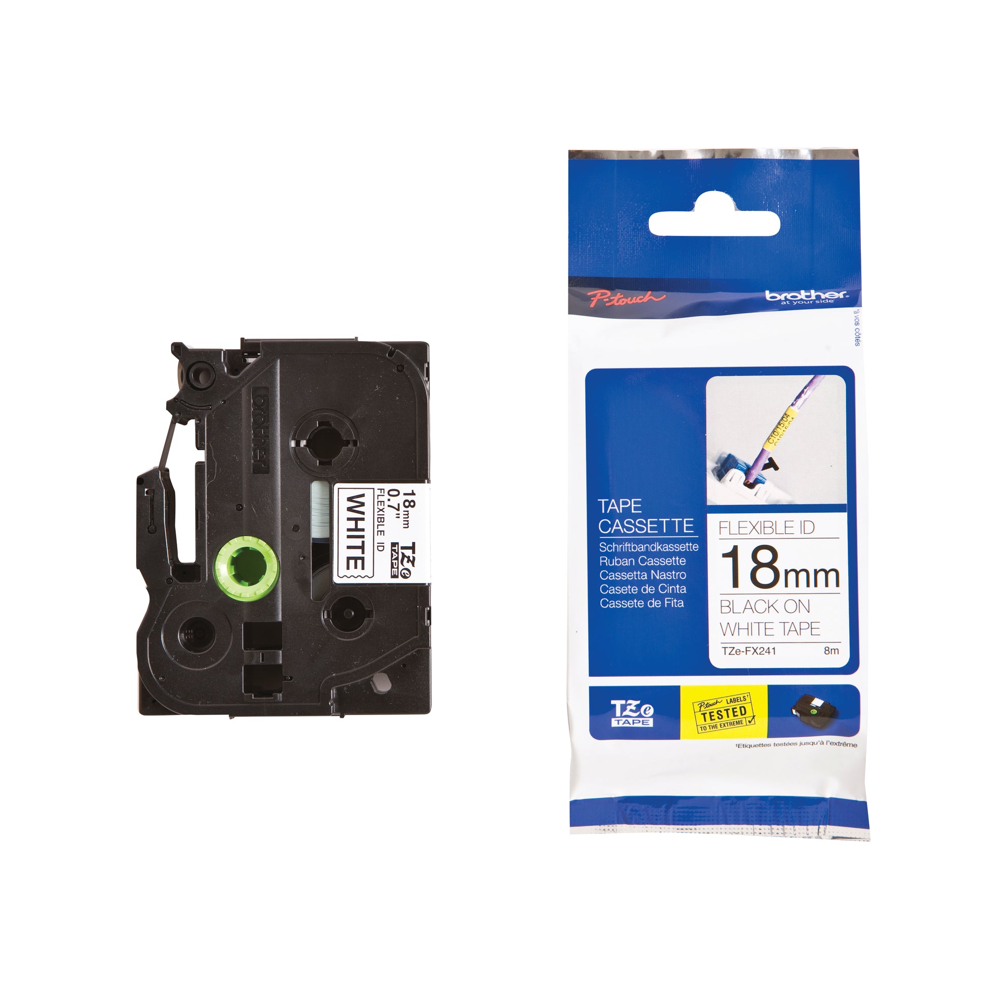 Brother Black on White TZe Labelling Tape 18mmx8m TZe-FX241. Labelling tape for Brother P-Touch label makers. Tape size: 18mmx8m. Colour: Black text on white background. Labels are self-adhesive for quick application.