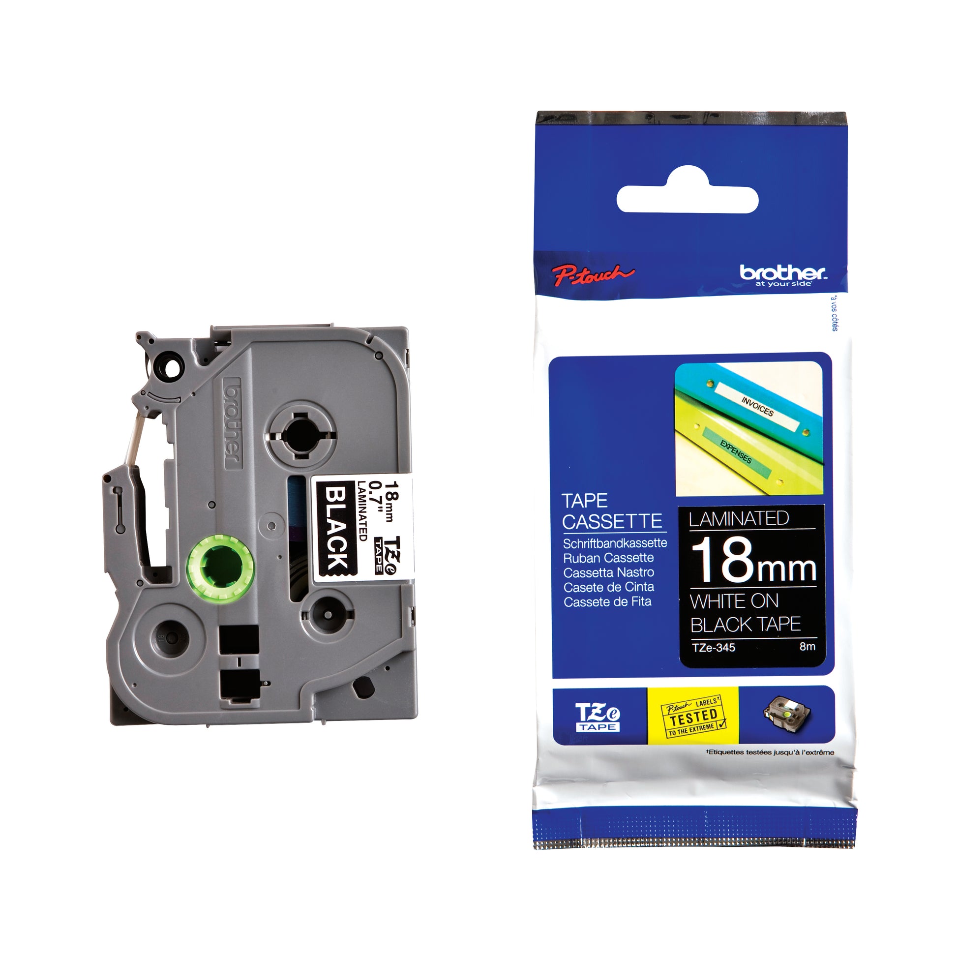 Brother TZe P-Touch Labelling Tape 18mm x 8m White on Black TZE345. Use with Brother P-touch label printers. Laminated. For use in the home, office or workplace. For use in extreme temperatures, resistant to chemicals, abrasion, sunlight and in water.