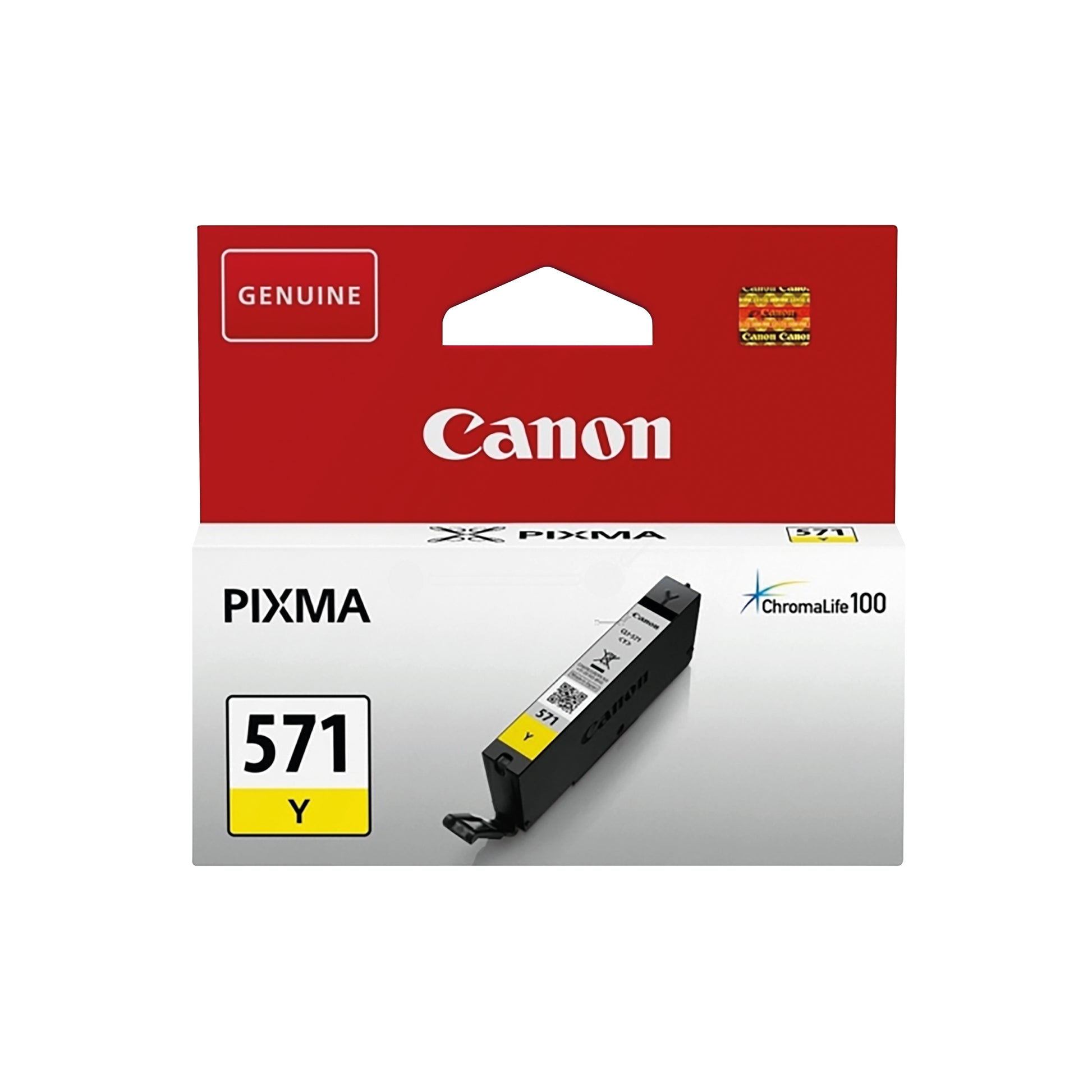 Canon CLI-571Y Inkjet Cartridge Yellow 0388C001. Colour: Yellow. Page yield: up to161 of 10x15cm colour photos. Canon PIXMA printers. Standard yield. Capacity: 7ml.
