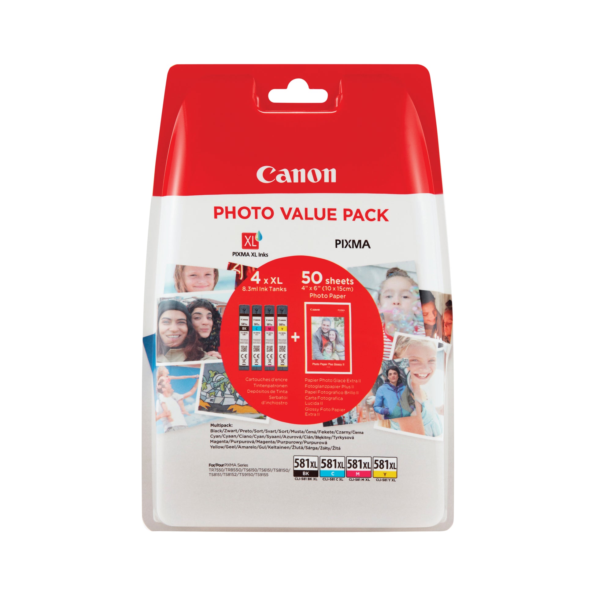 Canon CLI-581XL Inkjet Carts + Photo Paper Value Pack CMYK 2052C006. Page yield: up to 170 (C), 225 (M), 199 (Y), 520 (B). Compatible with: Canon PIXMA TR7550, TR8550, TS6150, TS6151, TS6250, TS6251, TS6350, TS6350a, TS6351, TS6351a, TS705, TS705a + more