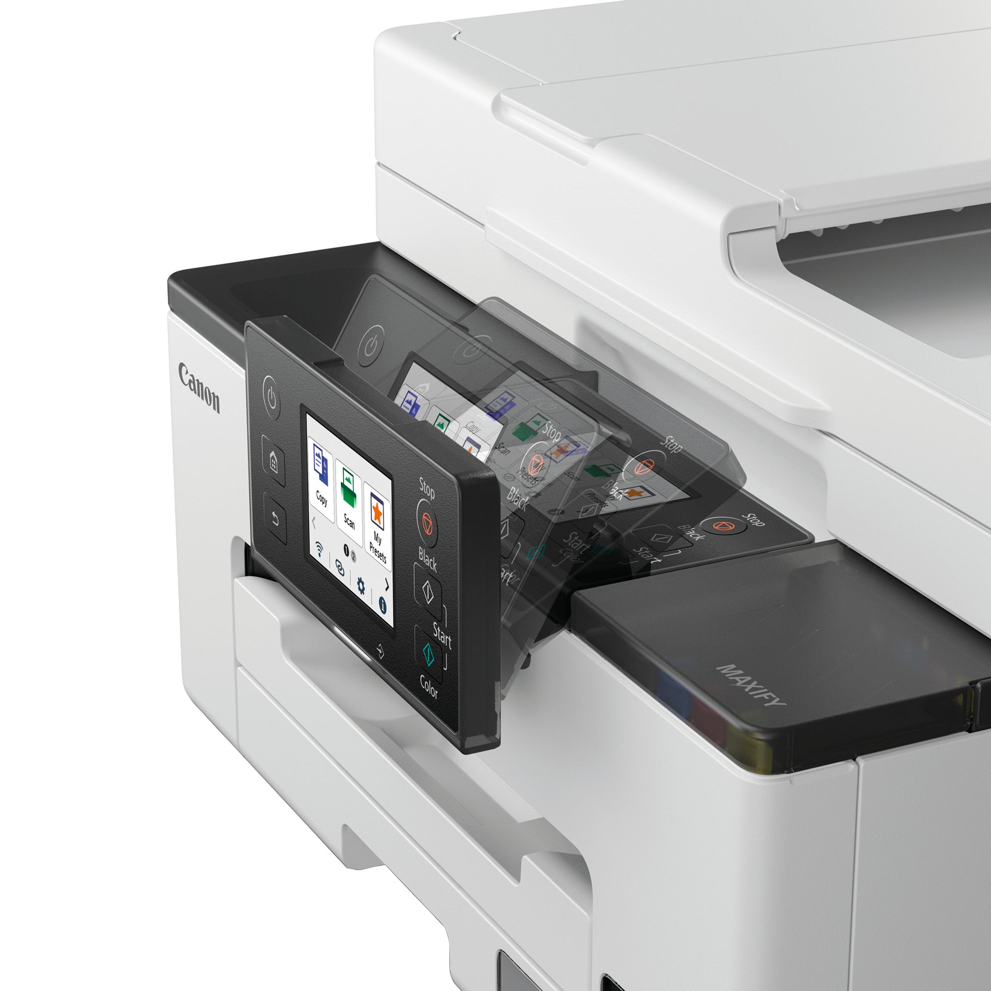 Compact, secure and user-friendly, this 4-in-1 printer gives home and hybrid workers the full office experience. The MAXIFY GX2050 is a perfect business printer for home use, able to print durable, smudge-free documents quickly and in high volumes, as well as easily scan, copy and fax multi-page documents thanks to its 35-sheet ADF (automatic document feeder); it can even scan directly to shared network folders or email. As with all Canon MegaTank models, its individual refillable ink tanks help to keep running costs low, while the tilting 6.7 cm LCD touchscreen makes this small office printer a pleasure to use.