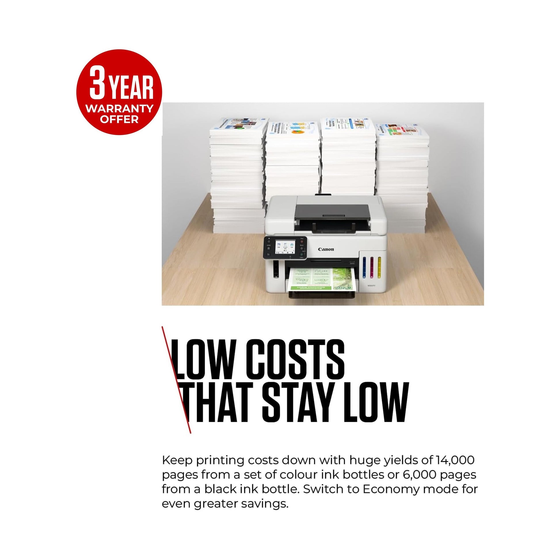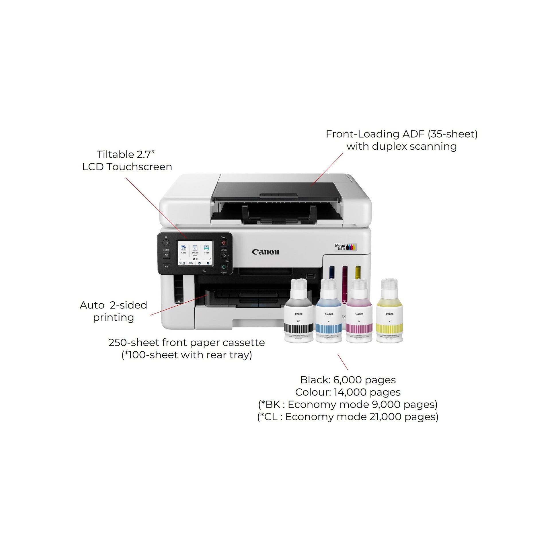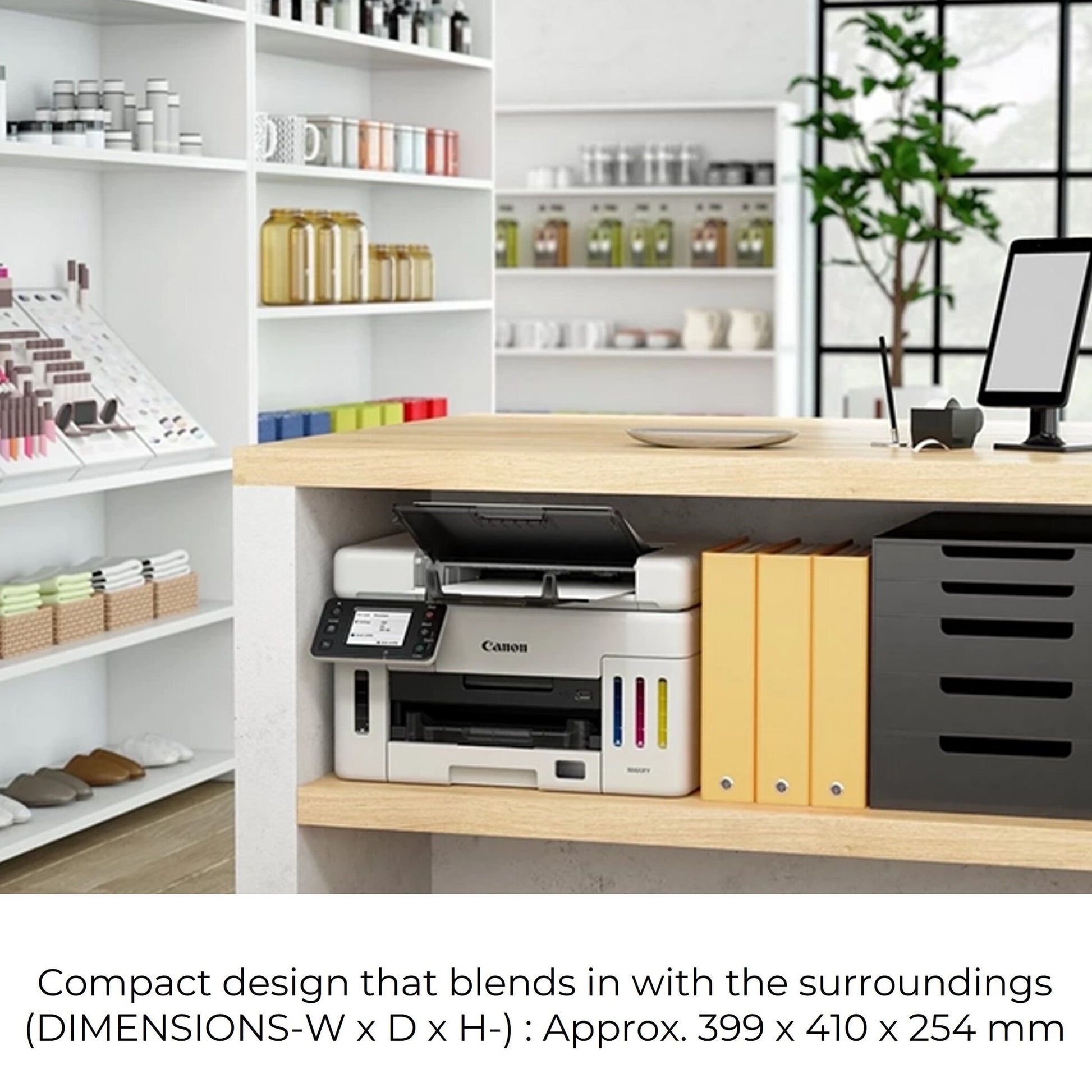 Operable entirely from the front thanks to its front-loading D-ADF, this compact 3-in-1 refillable ink printer is designed to deliver maximum productivity, even in smaller and confined spaces such as under counters or desks. With its refillable ink tanks offering high-speed, high-quality and low cost printing, plus Wi-Fi printing and enhanced network security, the MAXIFY GX6550 is a perfect fit for workplaces of all shapes and sizes.