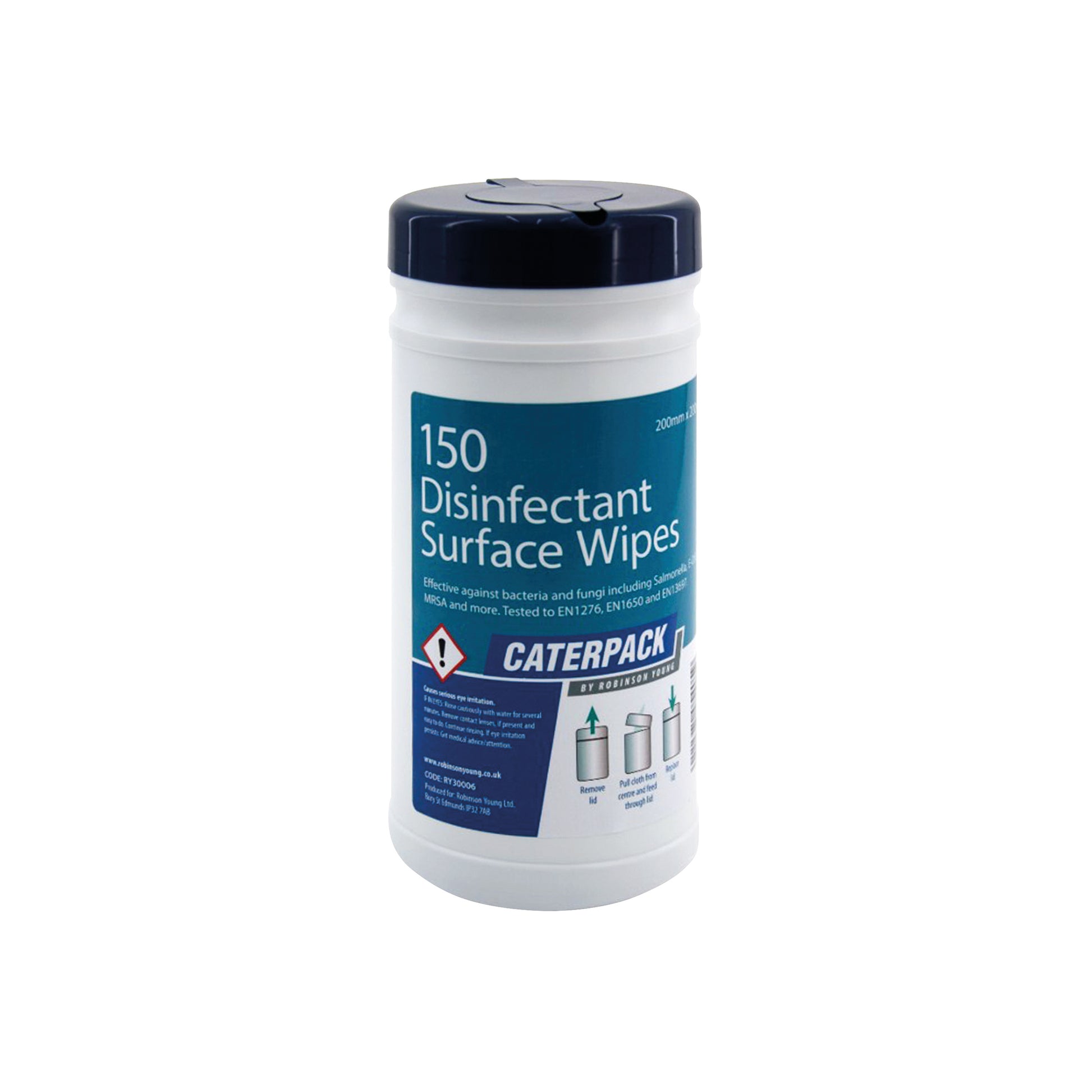 Caterpack Disinfectant Surface Wipes 150 Sheets RY30006. Suitable for disinfecting surfaces, utensils and catering equipment. Antibacterial. Fragrance-free. Gentle on skin and tough on bacteria.