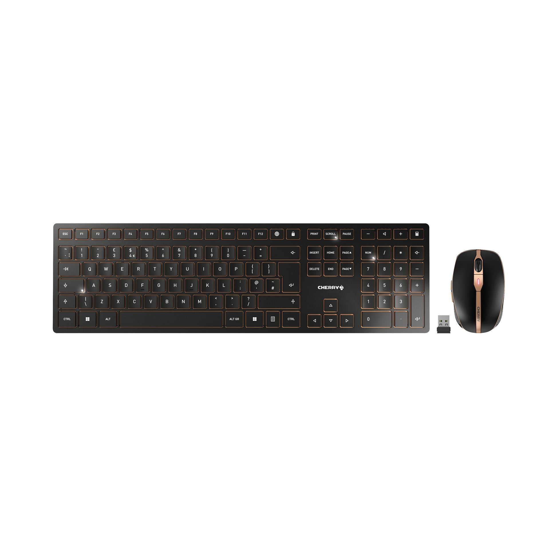 The CHERRY DW 9100 SLIM desktop set stands out due to its innovative functions, excellent workmanship and very flat design. You can connect the wireless mouse and keyboard with the 2.4-Ghz wireless USB receiver supplied or via Bluetooth®. You can switch connection types in an instant using a switch on the wireless mouse or keyboard. This allows e.g. a laptop to be connected via Bluetooth® 4.2 and a PC to be additionally connected via a wireless connection to be operated with the same desktop set. The data is transferred using AES-128 encryption in both cases. The range of up to 10 meters is also sufficient for e.g. multimedia applications on televisions.