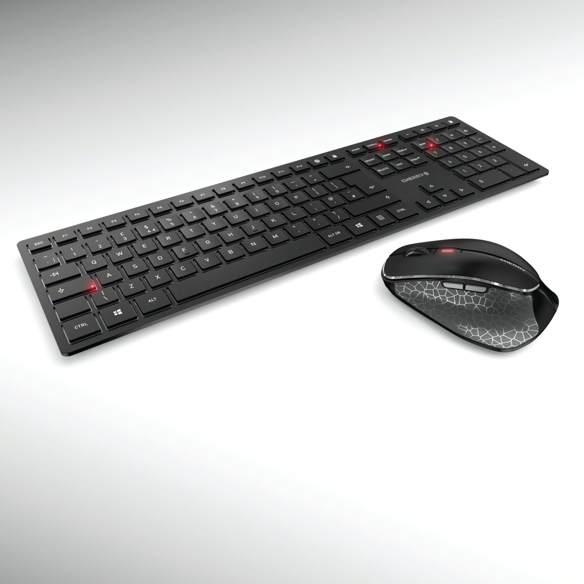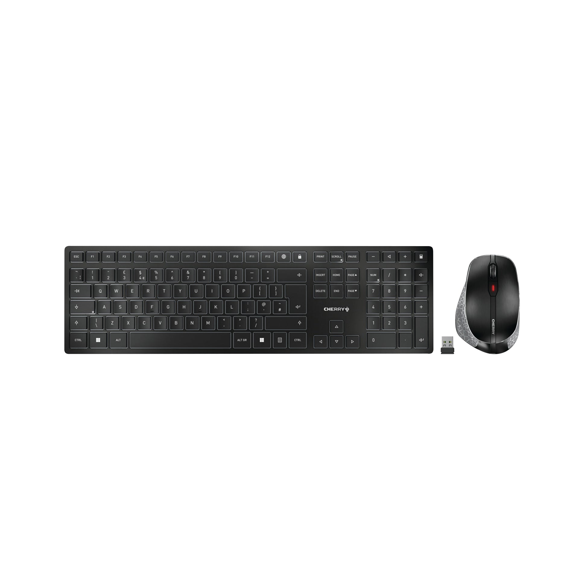 Cherry DW 9500 Slim Wireless Keyboard and Mouse Set QWERTY UK Black/Grey JD-9500GB-2. Connection via Bluetooth or 2.4 GHz wireless. AES-128 encryption for mouse/keyboard. Rechargeable lithium batteries. USB-C Connection.