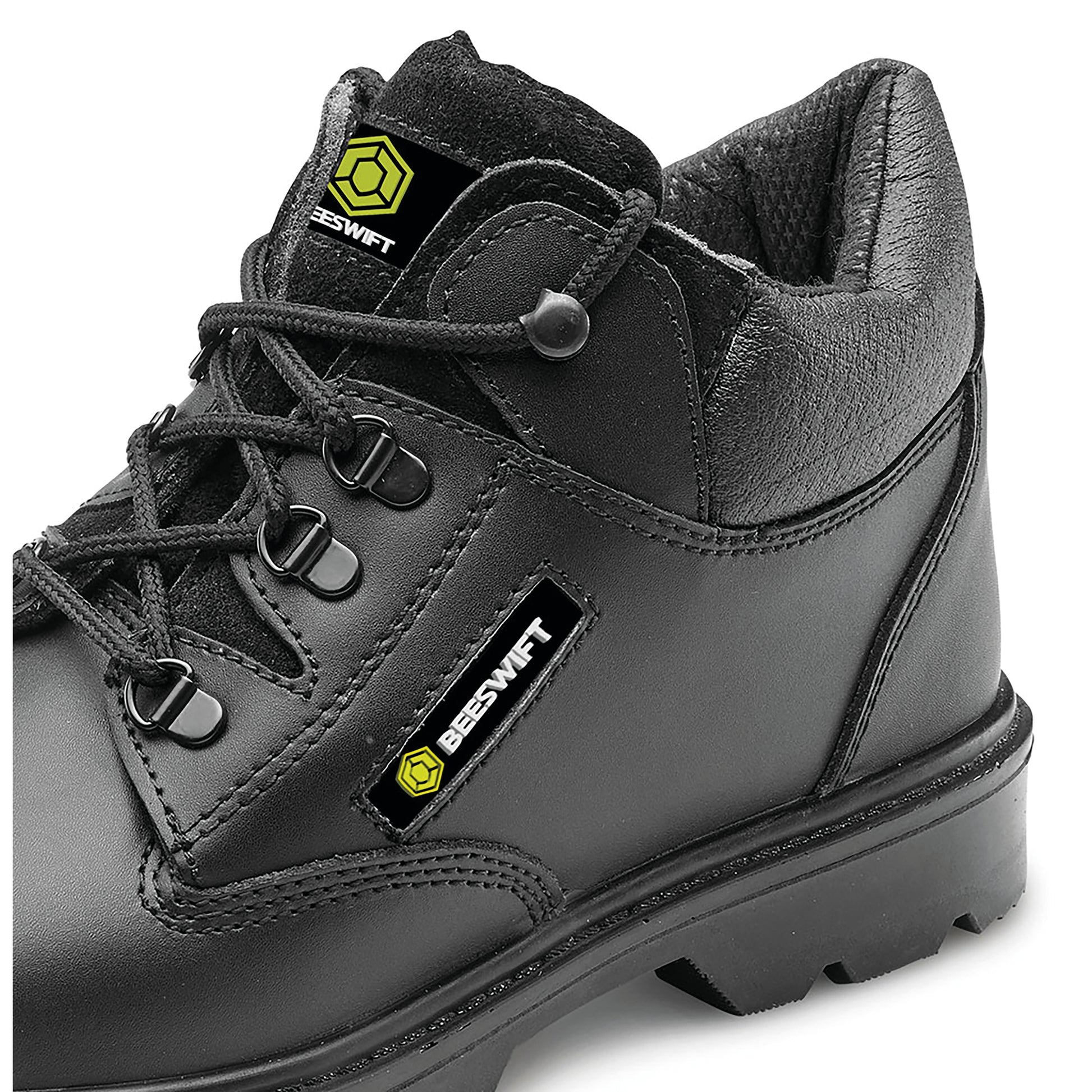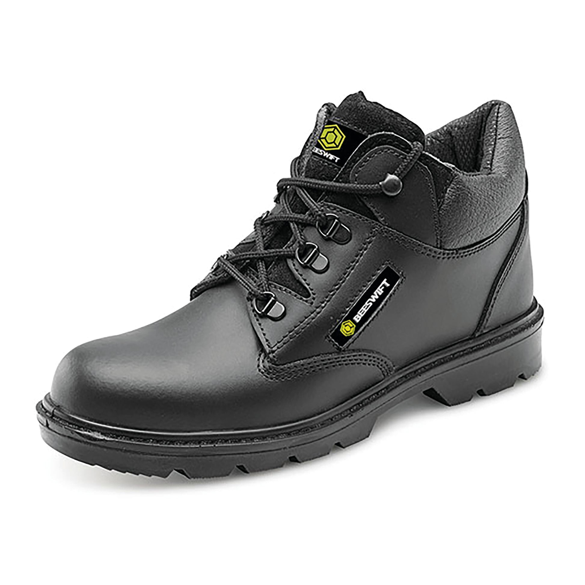 Beeswift Click Leather Mid Cut Midsole Steel Toe Capped Boot. Mid cut boot. Dual Density PU. Leather upper. 200 Joule steel toe cap. Steel midsole protection. Shock absorber heel. Anti-static. Slip resistant. Standard to EN ISO 20345:2011 S1P SRC.