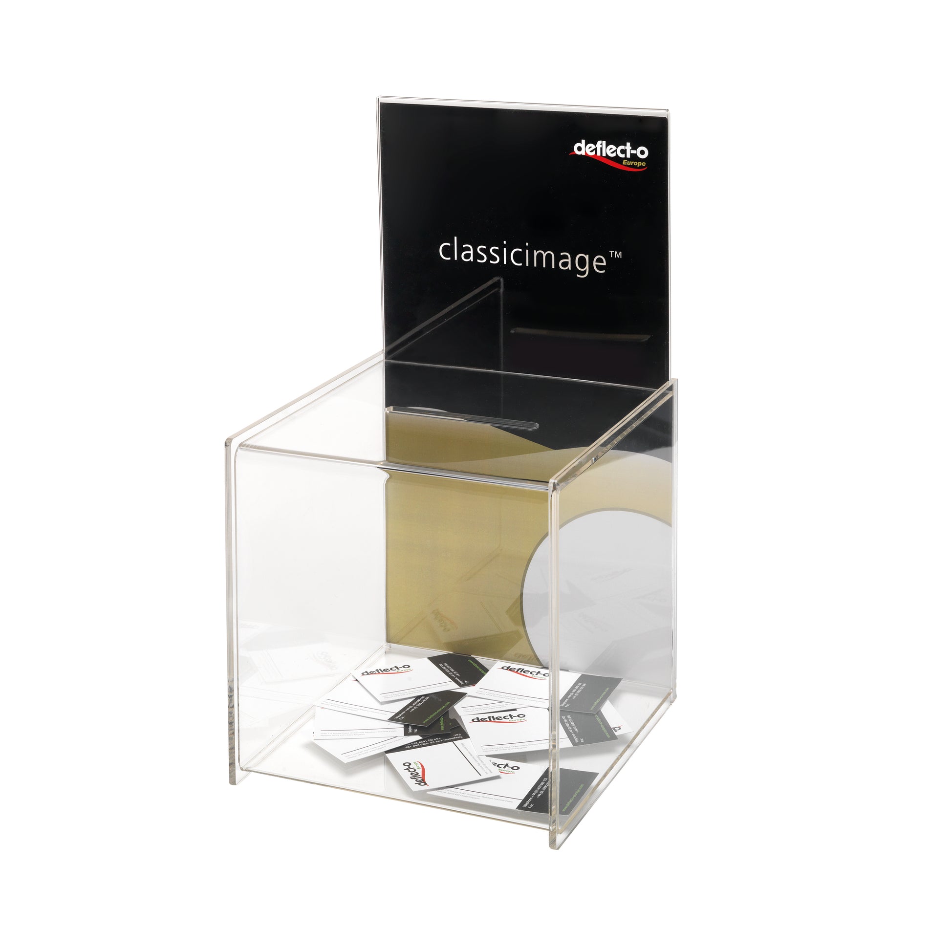 Deflect-O suggestion box with sign holder. Free standing clear box with holder to accommodate signs 203 x 375mm in size. Ideal for collections of business cards raffles suggestions and comments.