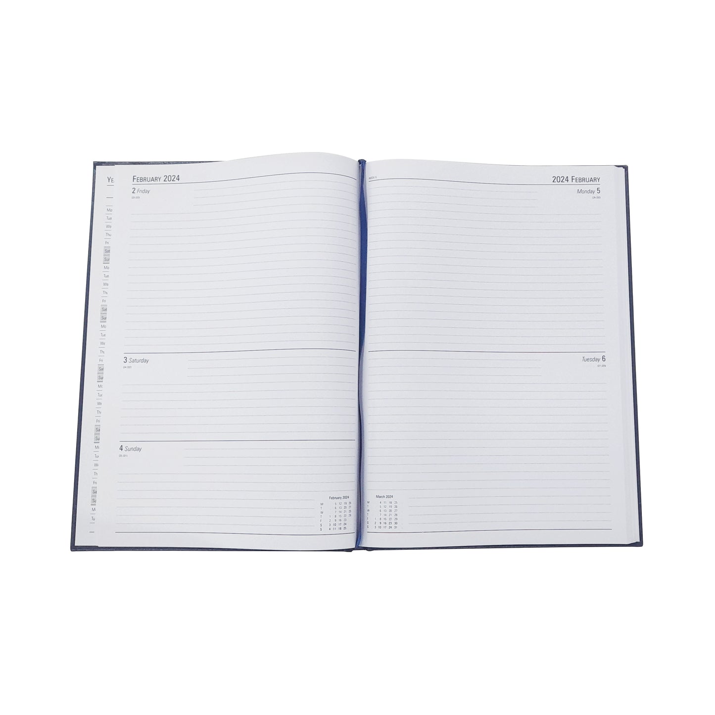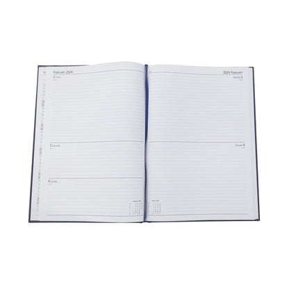 Desk Diary 2 Days Per Page A4 Blue 2024 KFA42BU24. Reference calendar on each page. Current and forward year planners. Ribbon page marker.