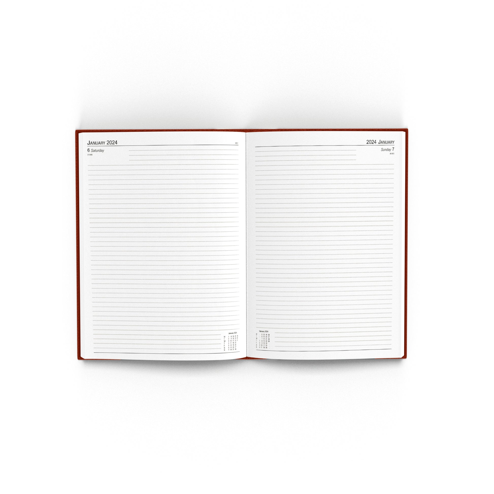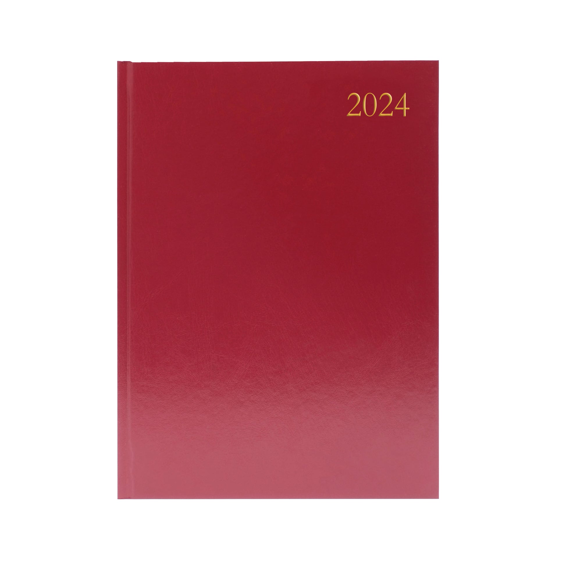 Desk Diary Day Per Page A4 Burgundy 2024 KFA41BG24. Reference calendar on each page. Current and forward year planners. Ribbon page marker.