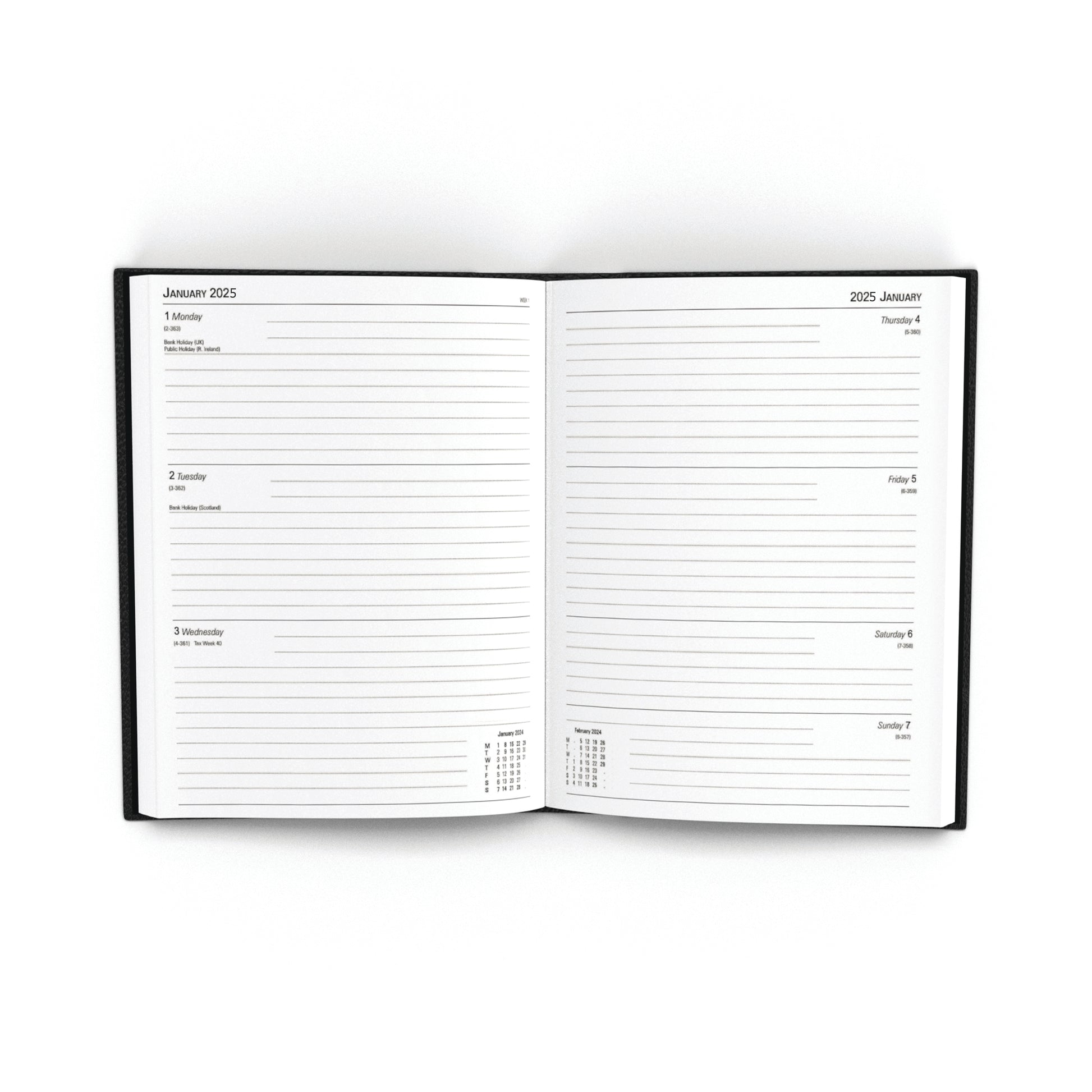 Desk Diary Week To View A5 Black 2025 KFA53BK25. Reference calendar on each page. Current and forward year planners. Ribbon page marker.
