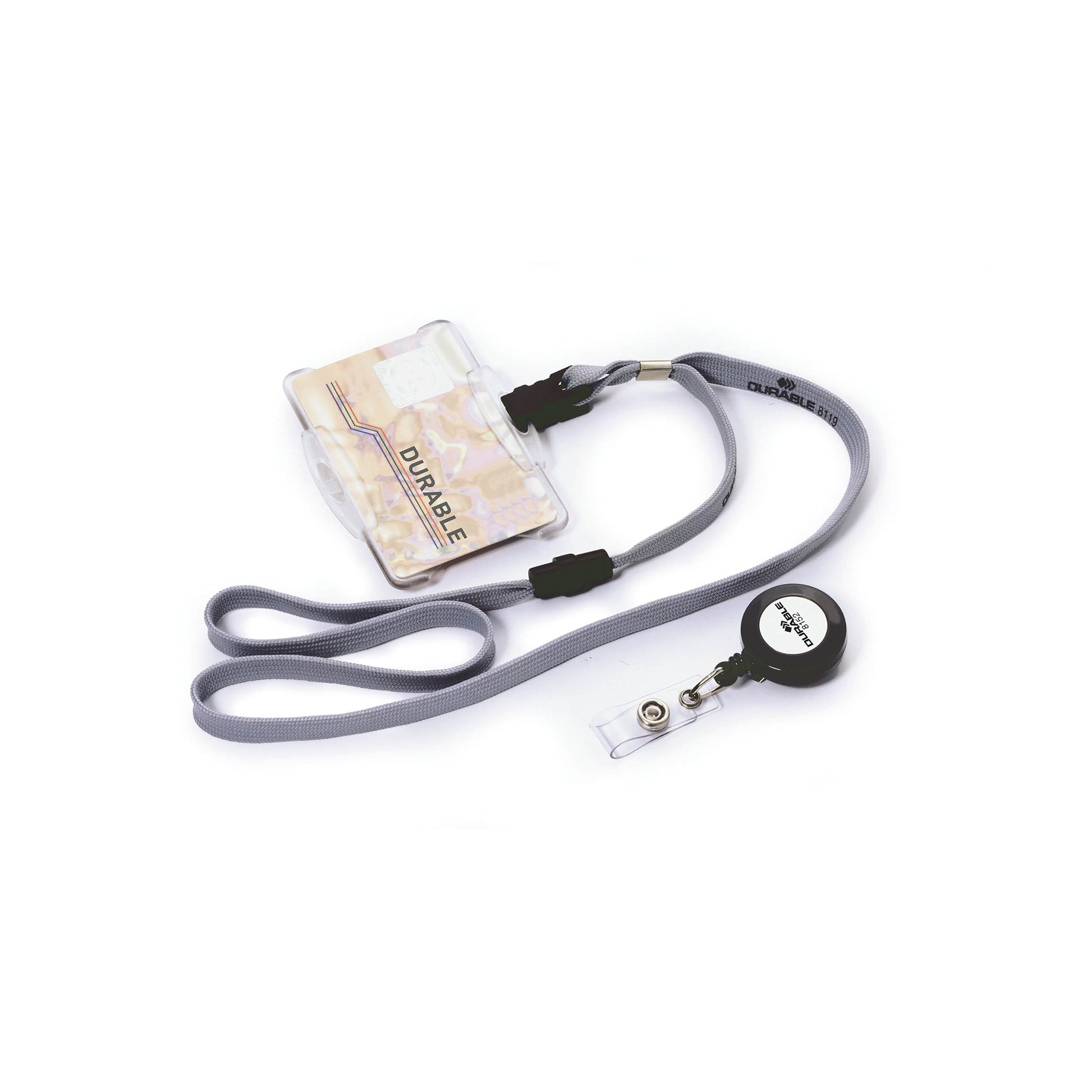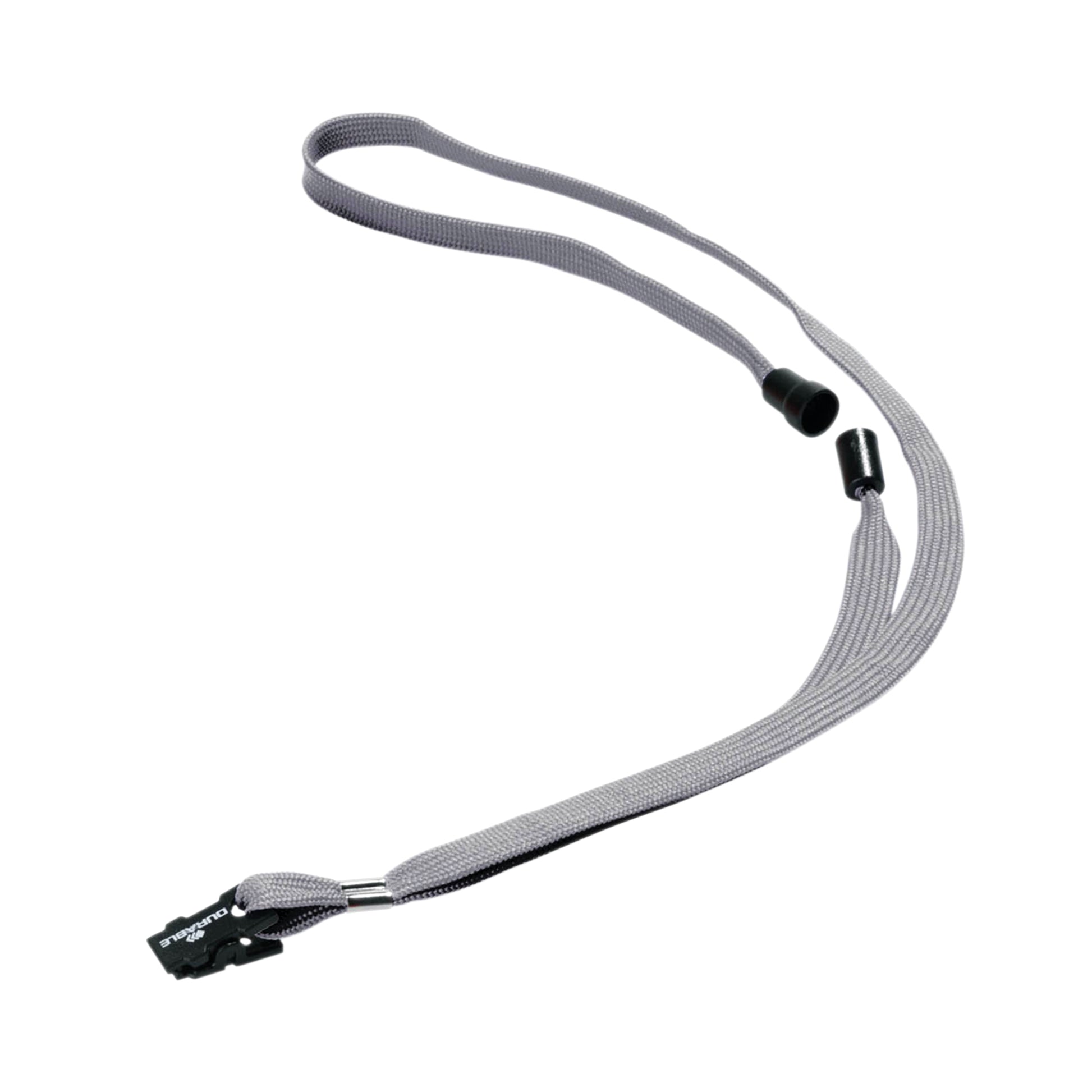 Durable Textile Name Badge Lanyard 10mm Grey (Pack of 10) 8119/10. 10mm thickness. Can be combined with every DURABLE name badge with punched holes. Lanyard has a safety release which opens should the lanyard become trapped/caught. Lanyard Length 440mm.