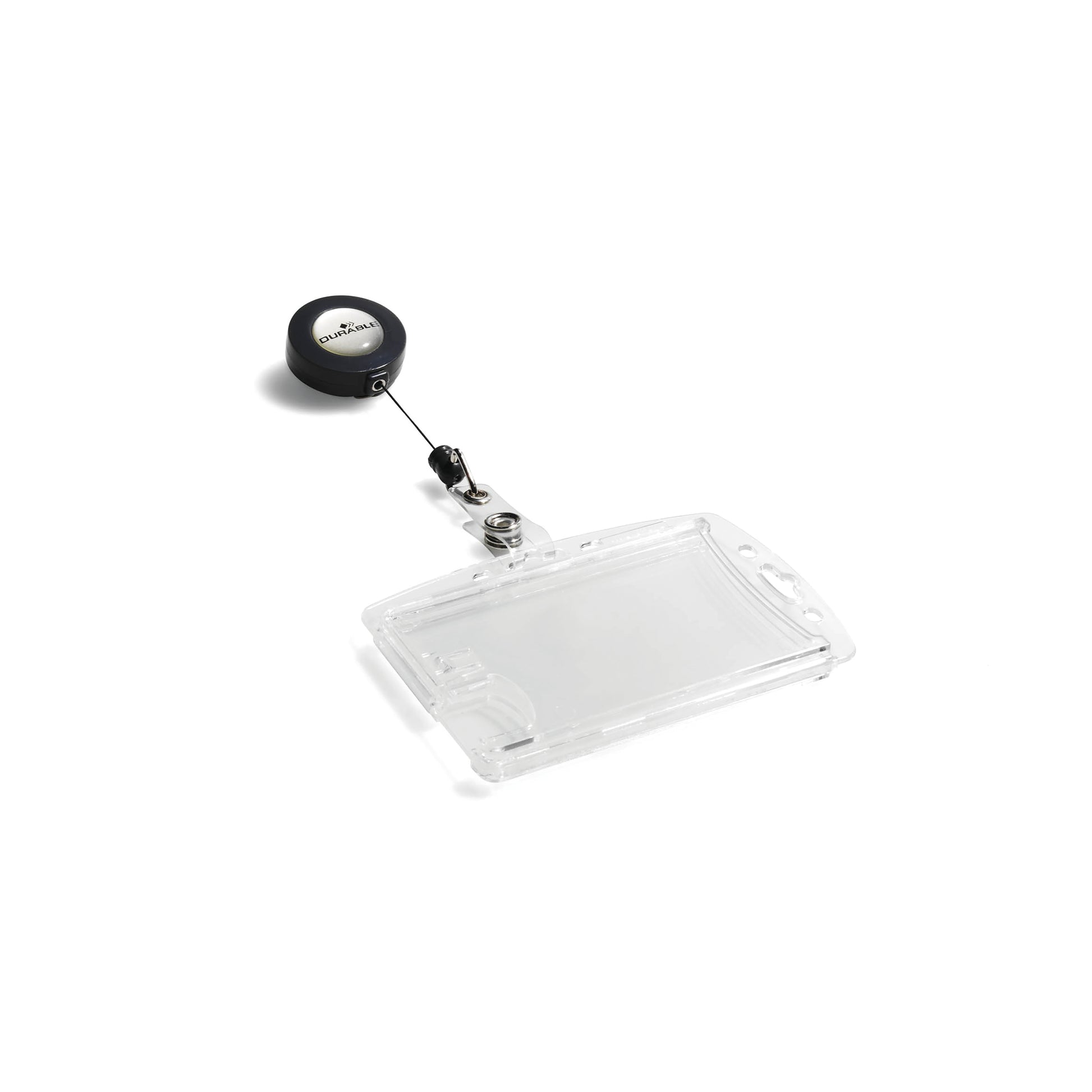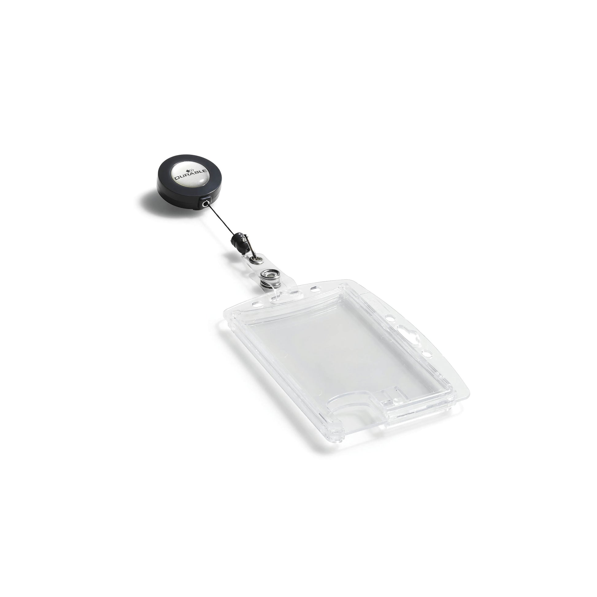 Durable Dual Security Pass Holder with Badge Reel Clear (Pack of 10) 8224/19. For 2 security passes. Integrated thumb slot. Additional badge reel supplied length 80mm allows the pass holder to be securely attached to clothing. For ID cards 54x90mm.
