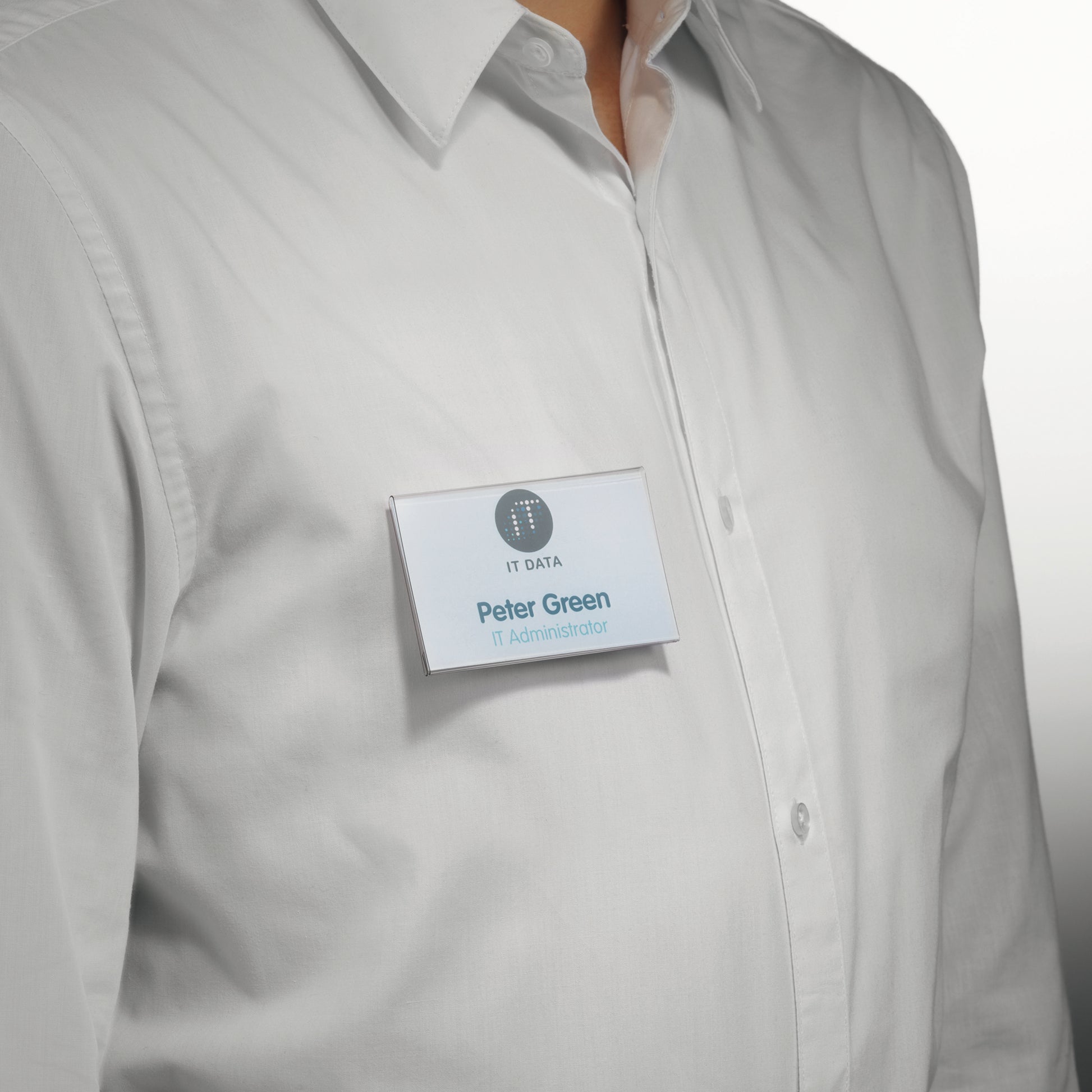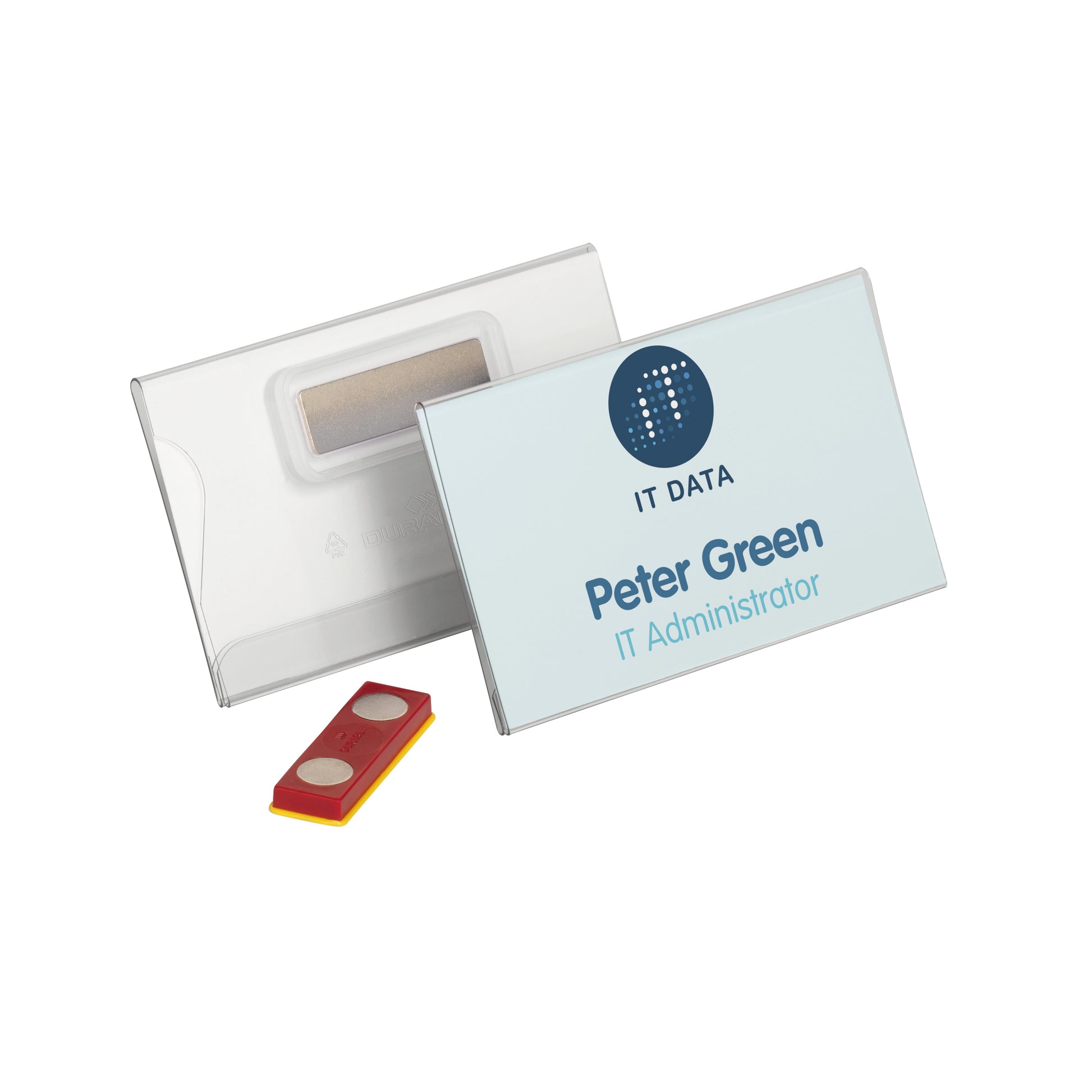 Durable Name Badge w/Magnet Place and Hold 54x90mm (Pack of 25) 824419. Name badge with magnetic fastening. Prevents name badge from twisting, slipping or coming loose when worn. Comfortable to wear and good readability.