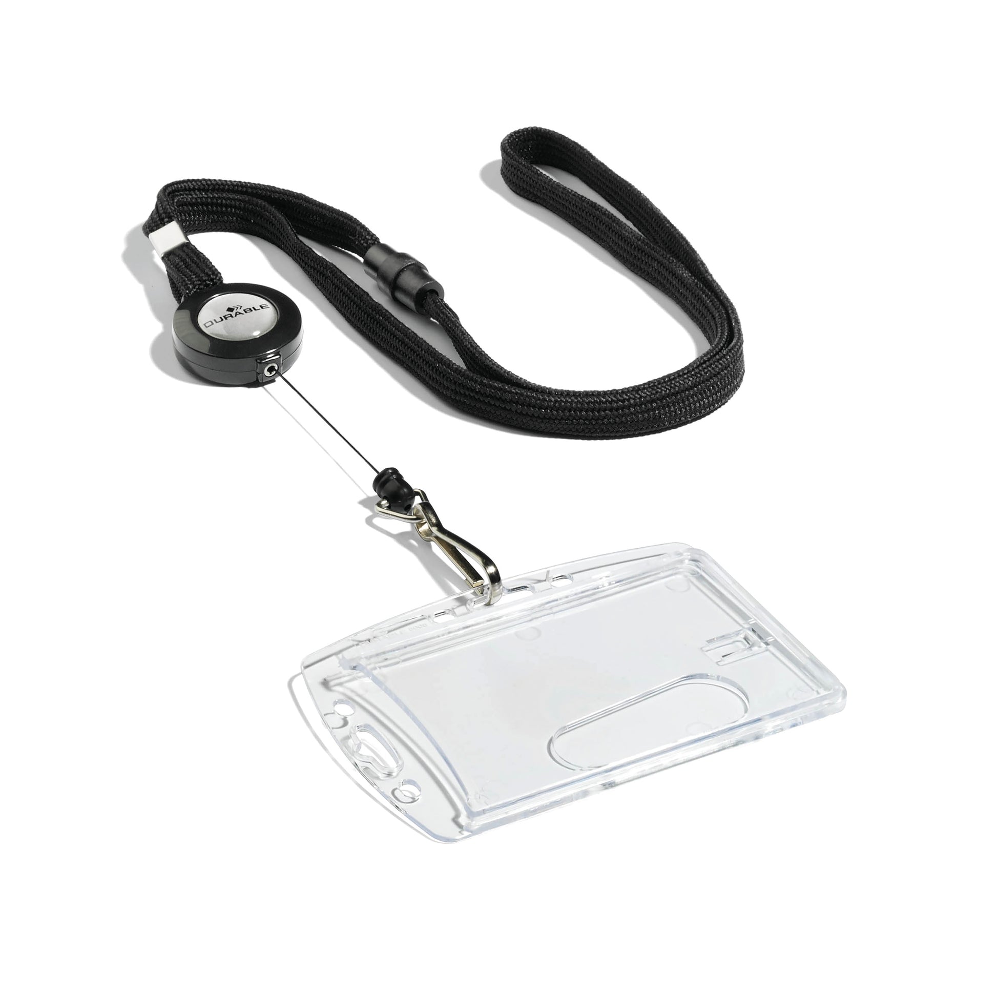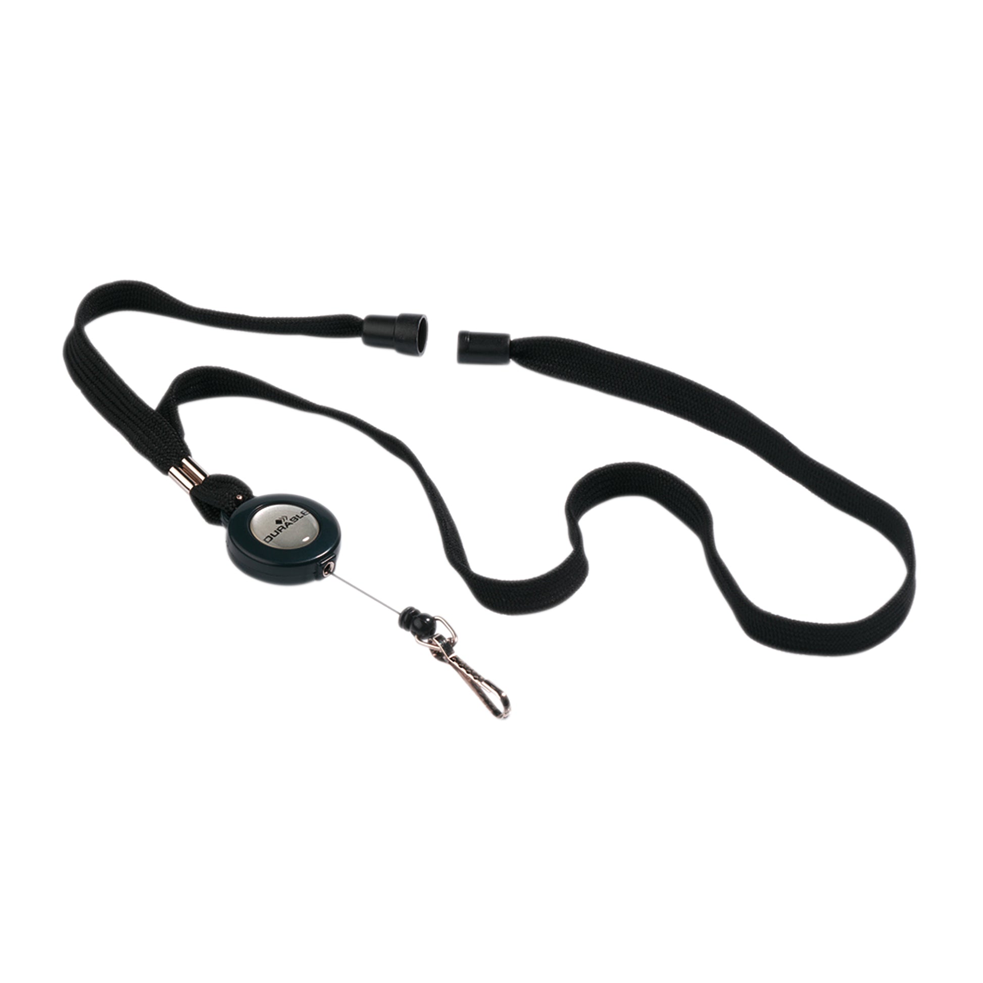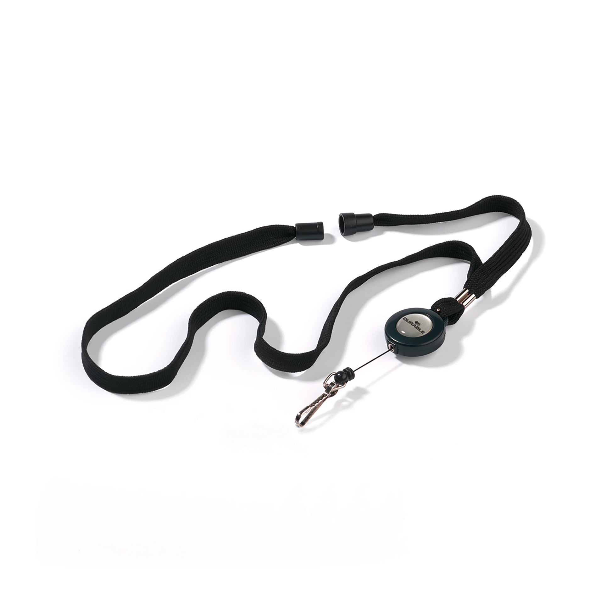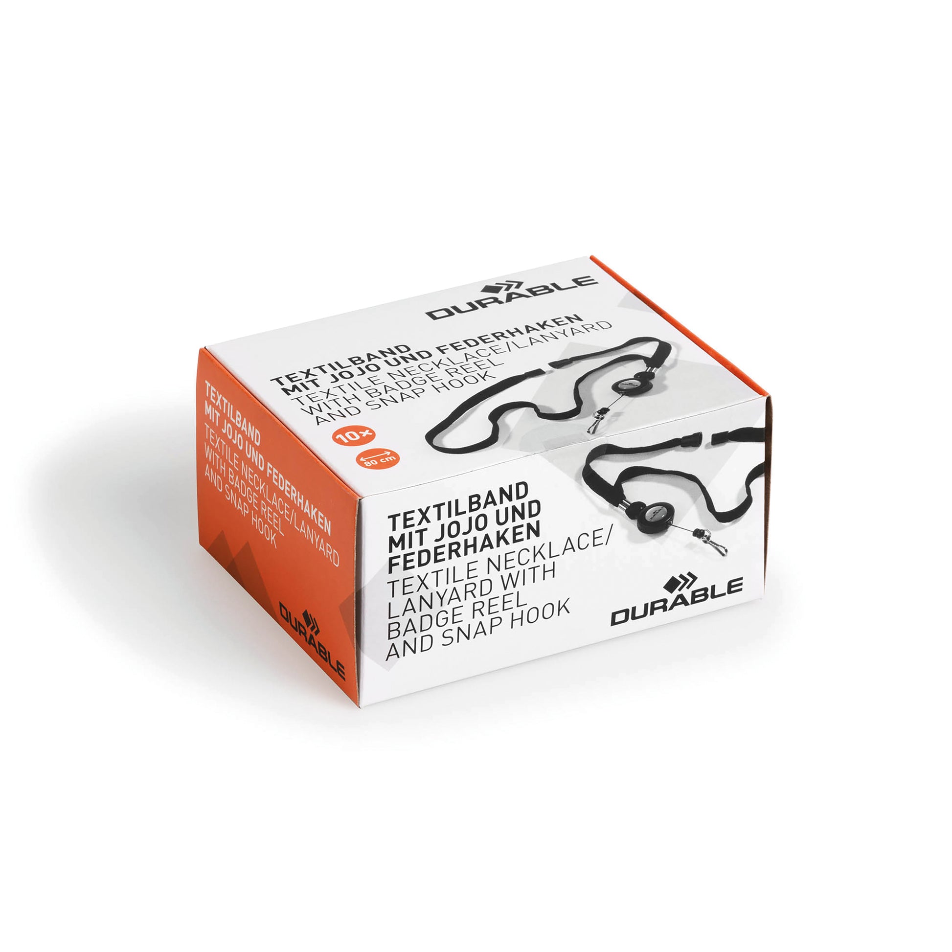Durable Textile Lanyard with Badge Reel Black (Pack of 10) 8223/01. Extendable reel and safety release. Can be combined with Durable name badges. Pack of 10.