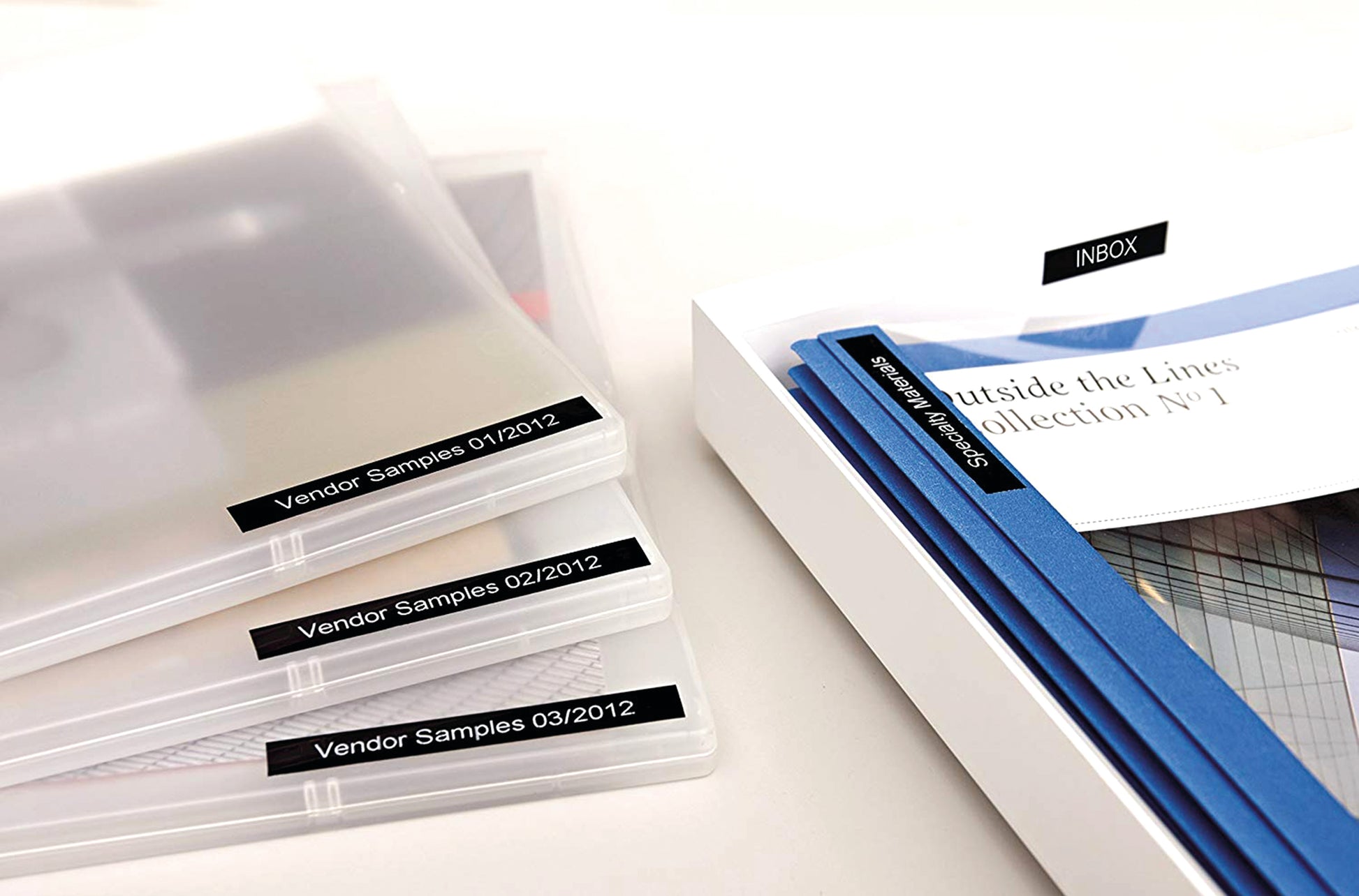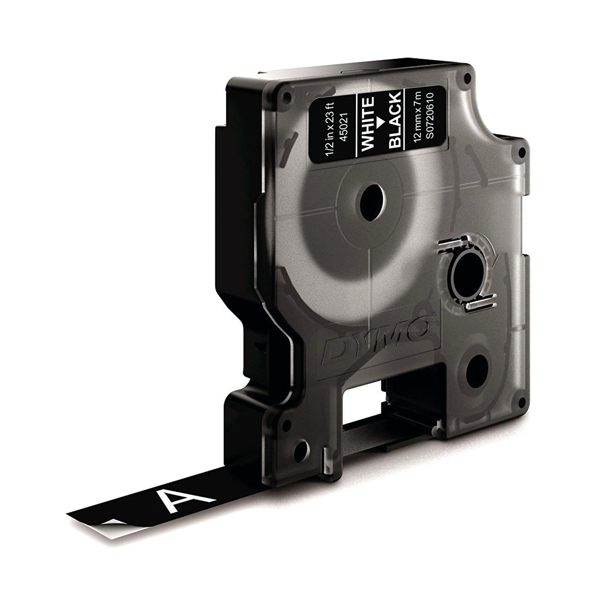 Labelling tape for home and office use. Designed for D1-compatible label makers. Made from general purpose polyester. Self-adhesive backing. Compatible with LabelManager and MobileLabeler printers. Prints white on black. Width: 12mm on a a 7m roll.