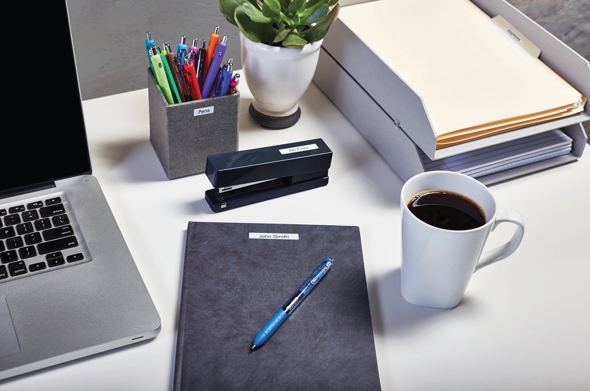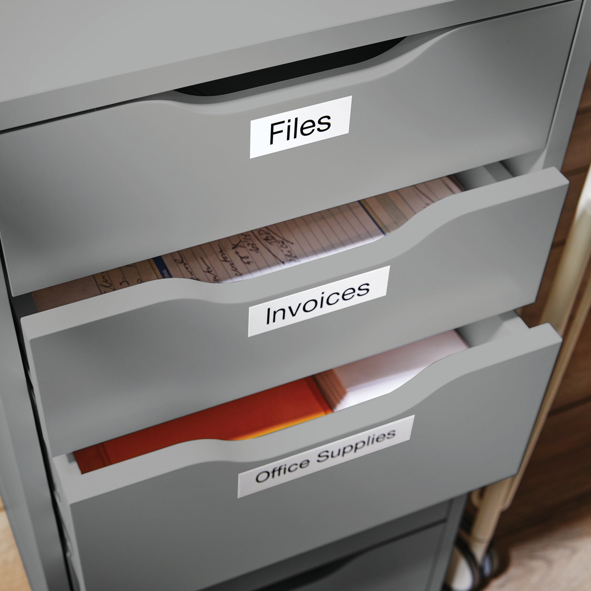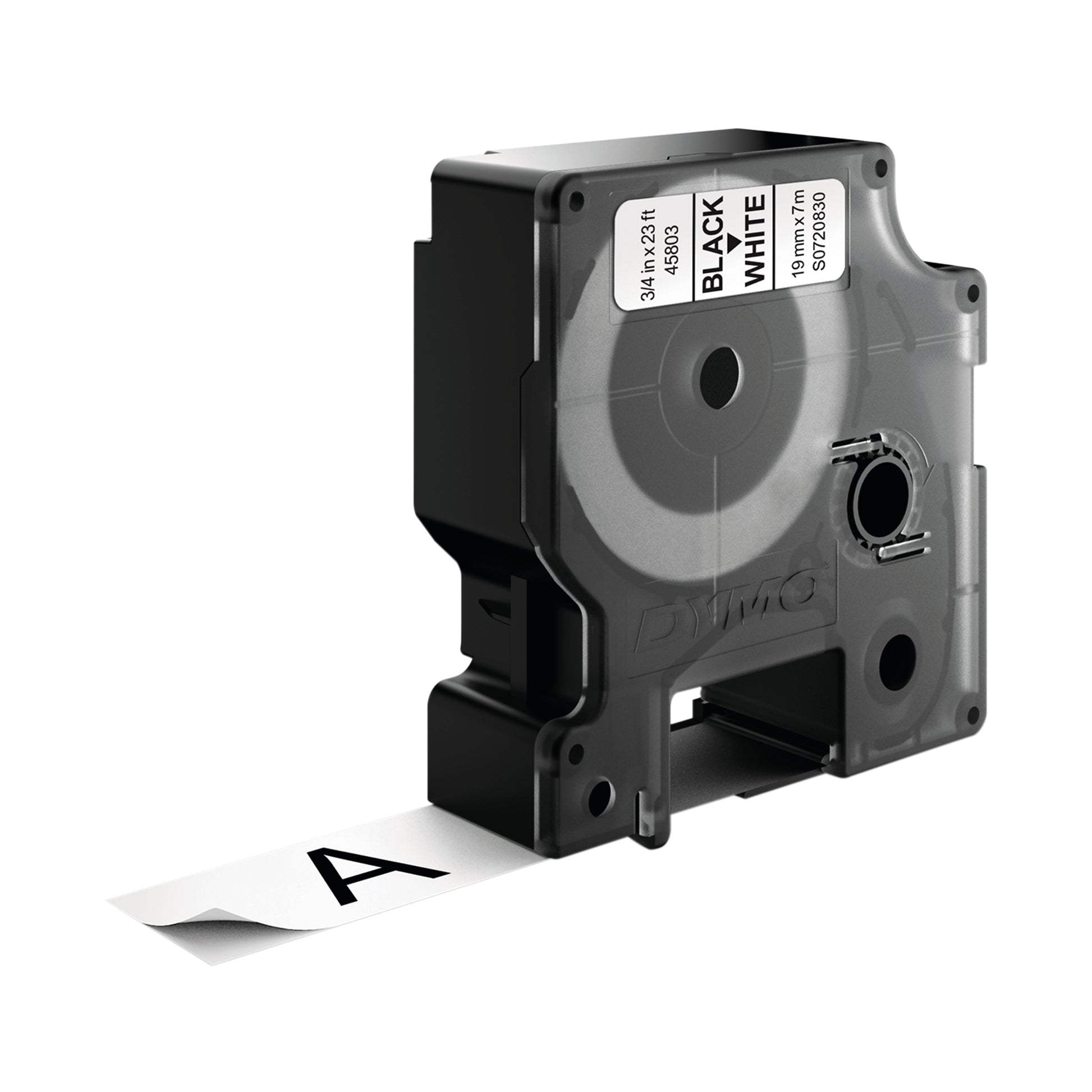 Labelling tape for home and office use. Designed for D1-compatible label makers. Made from general purpose polyester. Self-adhesive backing. Compatible with LabelManager and MobileLabeler printers. Prints black on white. Width: 19mm on a a 7m roll.