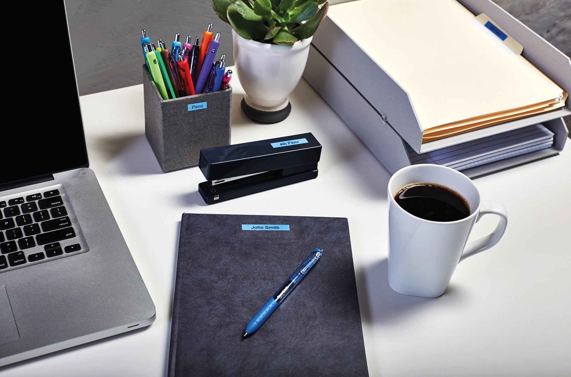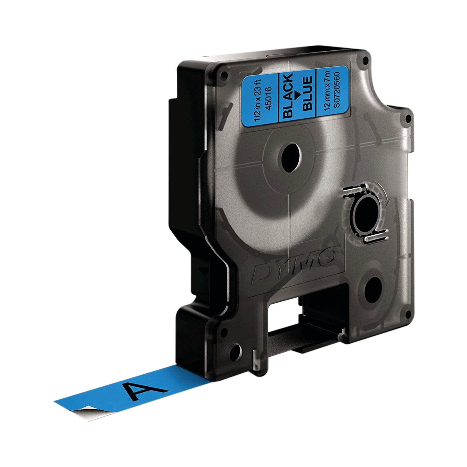 Labelling tape for home and office use. Designed for D1-compatible label makers. Made from general purpose polyester. Self-adhesive backing. Compatible with LabelManager and MobileLabeler printers. Prints black on blue. Width: 12mm on a a 7m roll.