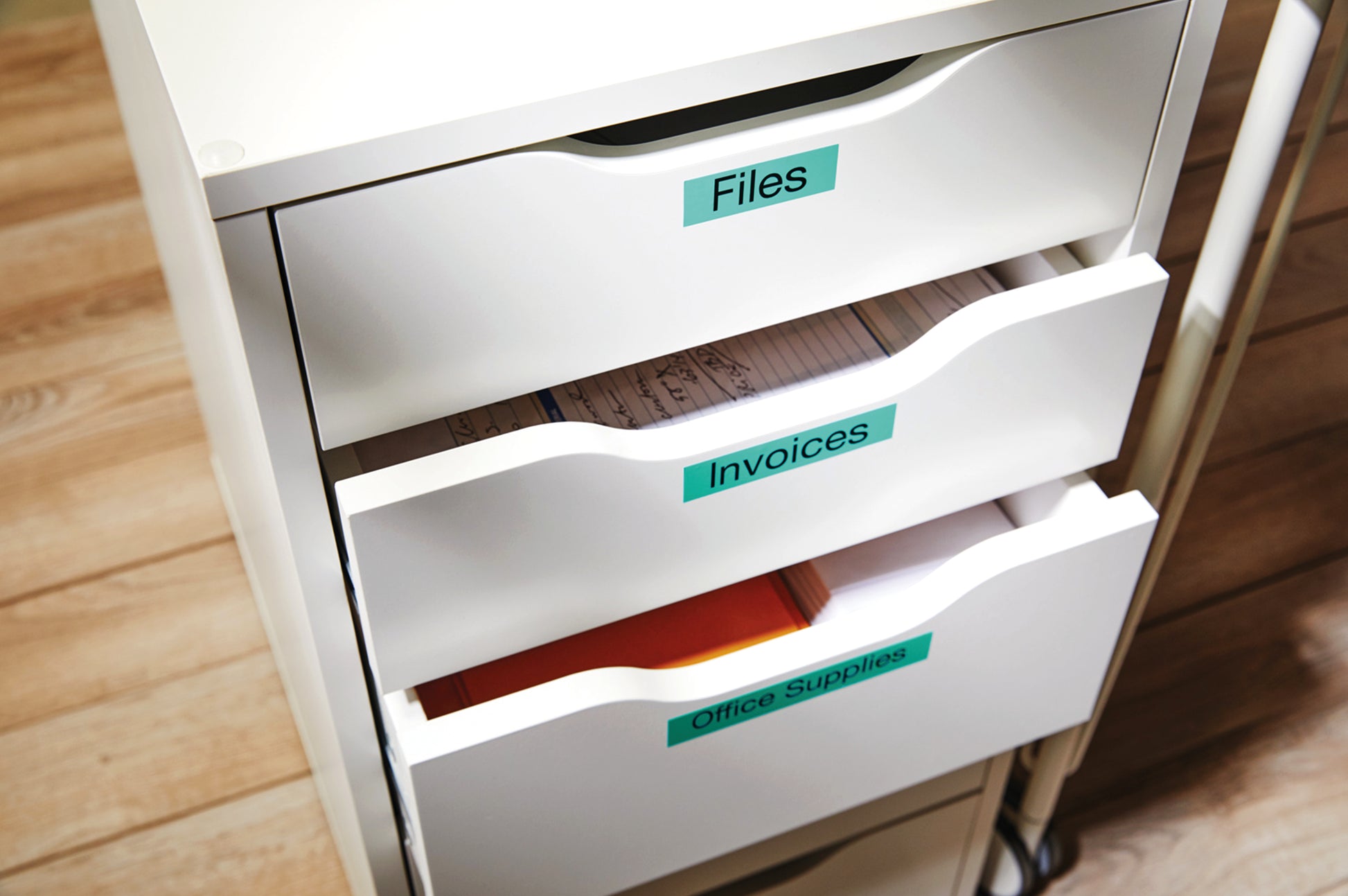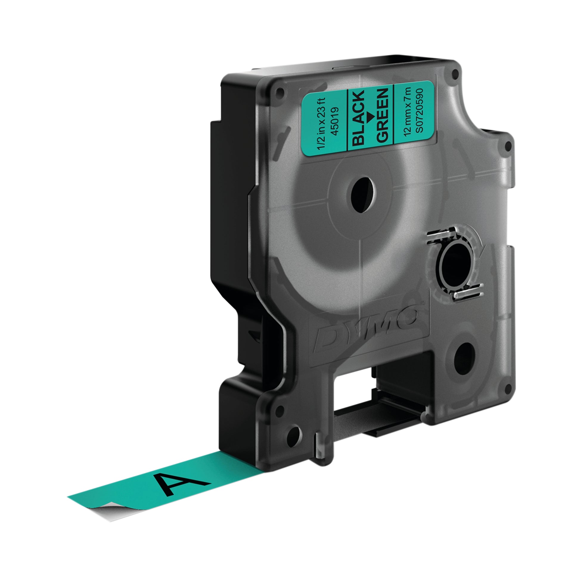 Labelling tape for home and office use. Designed for D1-compatible label makers. Made from general purpose polyester. Self-adhesive backing. Compatible with LabelManager and MobileLabeler printers. Prints black on green. Width: 12mm on a a 7m roll.