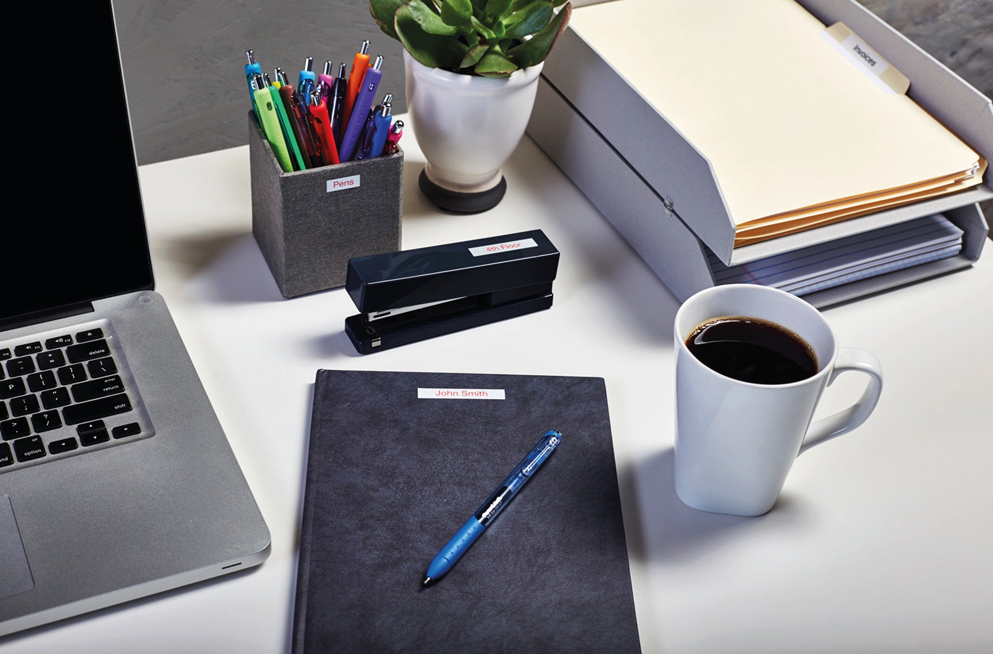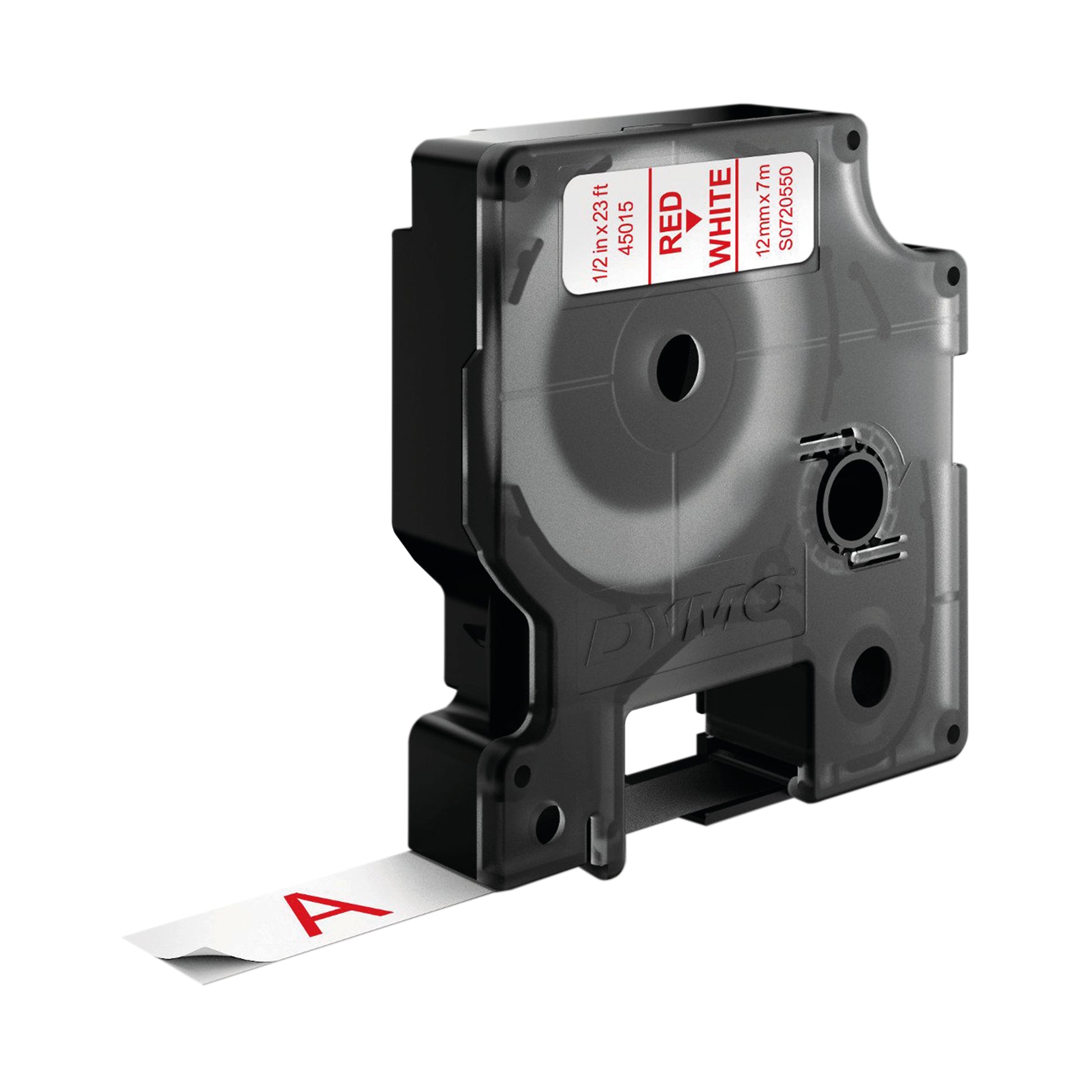 Labelling tape for home and office use. Designed for D1-compatible label makers. Made from general purpose polyester. Self-adhesive backing. Compatible with LabelManager and MobileLabeler printers. Prints red on white. Width: 12mm on a a 7m roll.