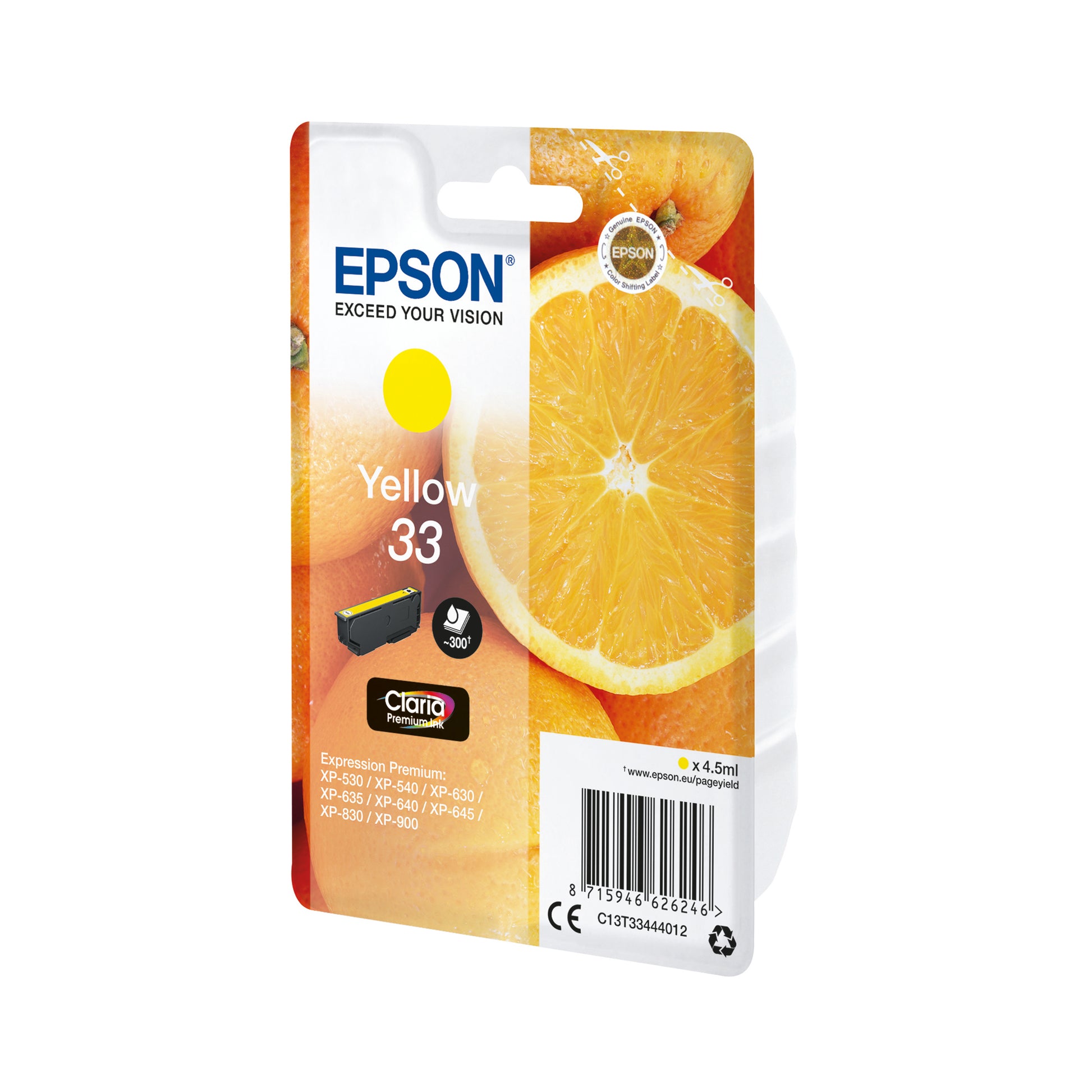Epson 33 Yellow Inkjet Cartridge C13T33444012. Colour: Yellow. Print yield: 300 pages. For use with Expression Premium XP-530/540/630/635/640/645/830/900.