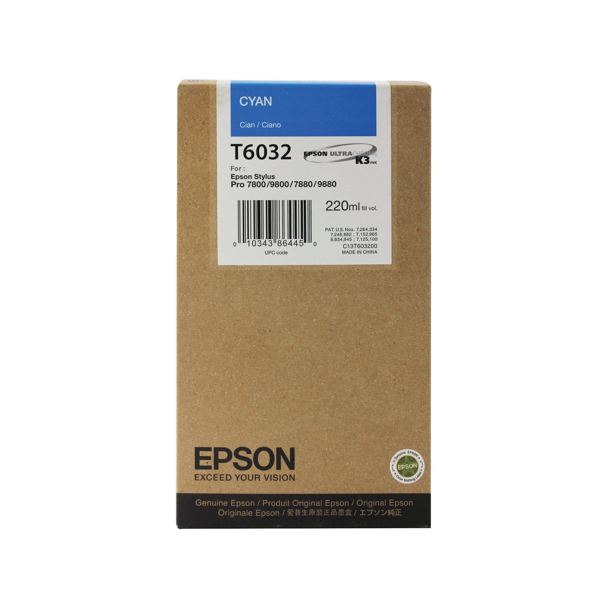 Cyan inkjet cartridge for Epson large format printers. Genuine Epson T6032 cartridge. For use with the Epson Stylus Pro 7800/9800. One of nine ink cartridges for wide colour gamut. Epson UltraChrome K3 ink for crisp long-lasting prints. Capacity: 220ml.