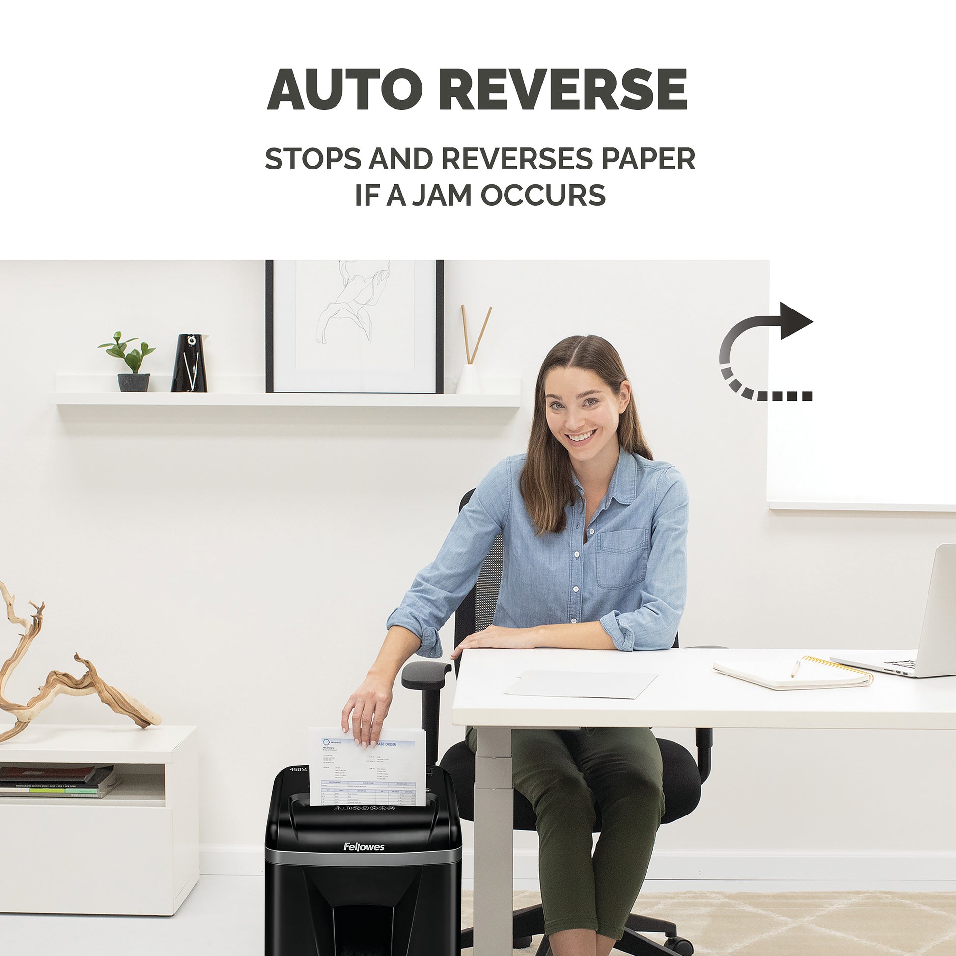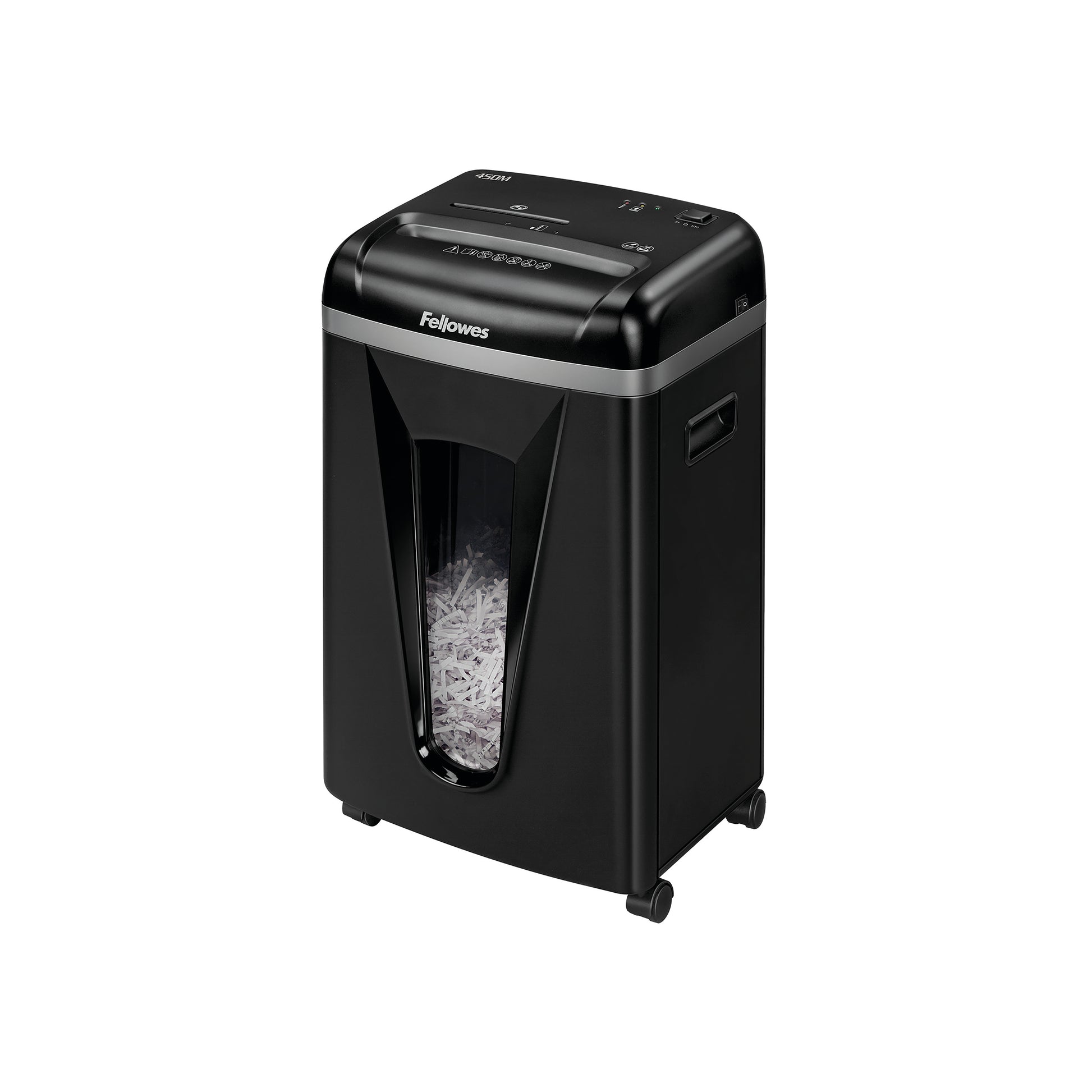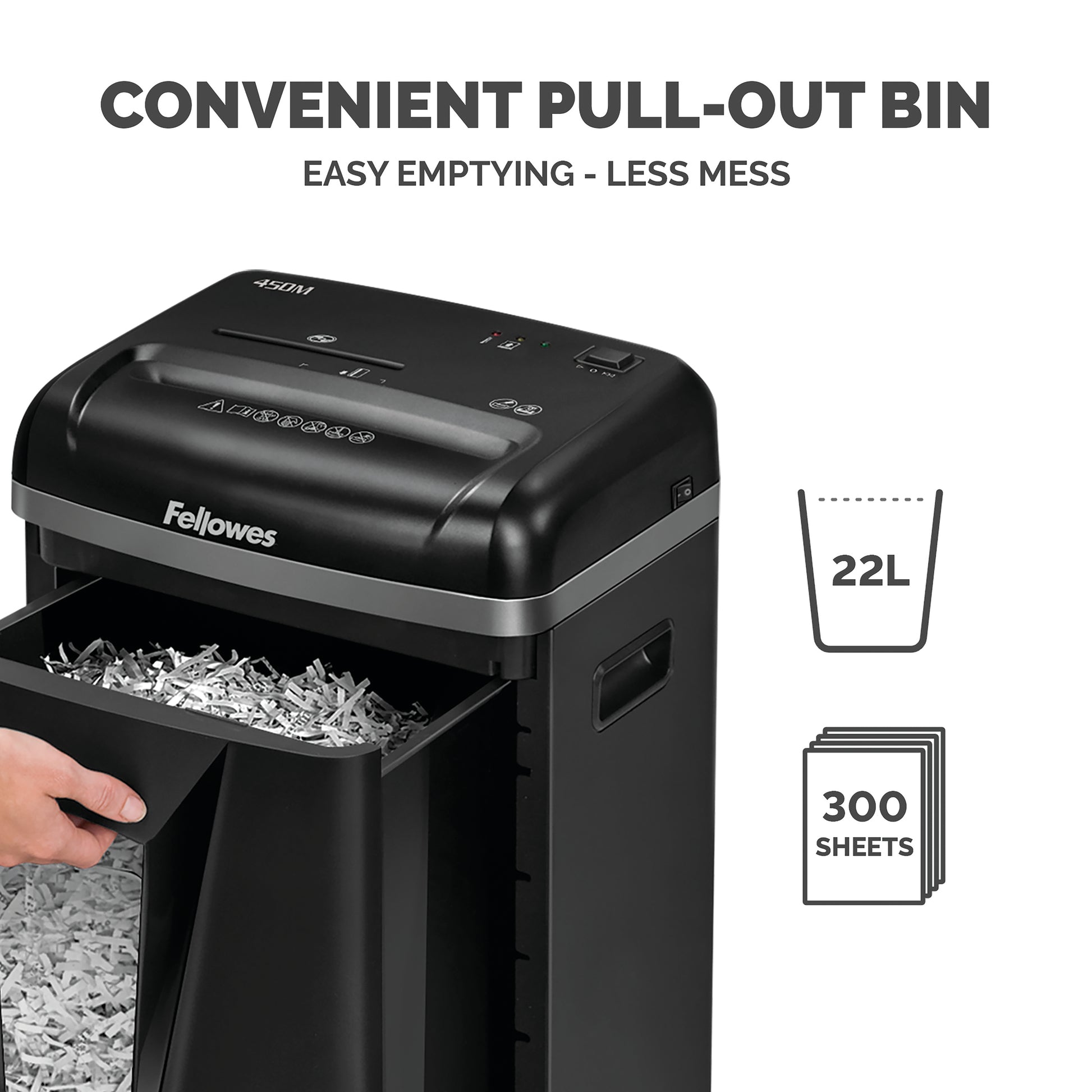 Fellowes 450M Micro Cut Shredder Black 4074201. Shreds up to 9 sheets at a time into 2x12mm micro-cut particles. P-5 security level. SilentShred. Auto reverse function. 22L bin. W351xD260xH565mm.