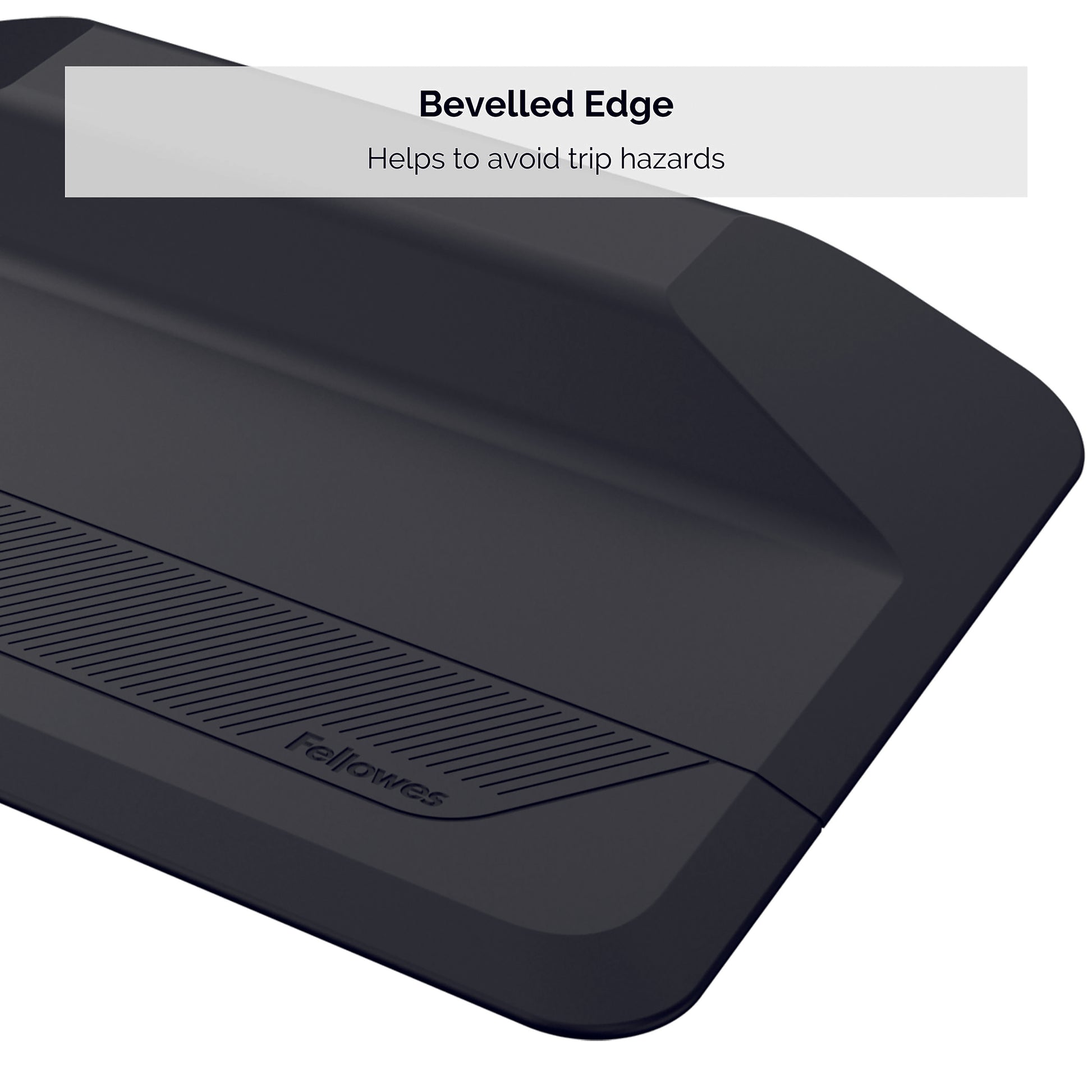 Fellowes ActiveFusion Anti-Fatigue Sit-Stand Mat Black 8707101. Unique stepped design promotes stretching/encourages subtle movement. Helps to prevent fatigue. Bevelled edges to help avoid trip hazards. Dimensions: 914x610x89mm.