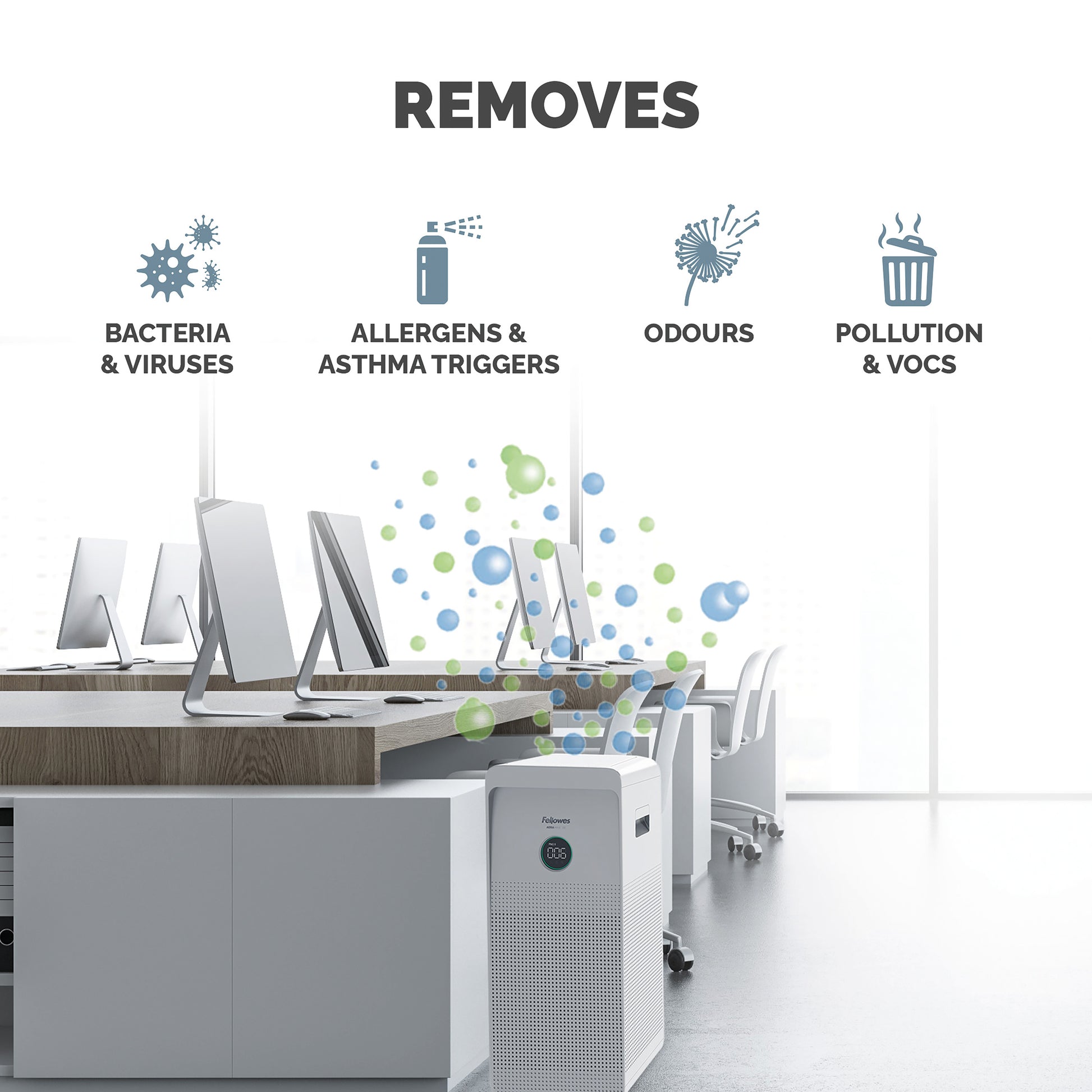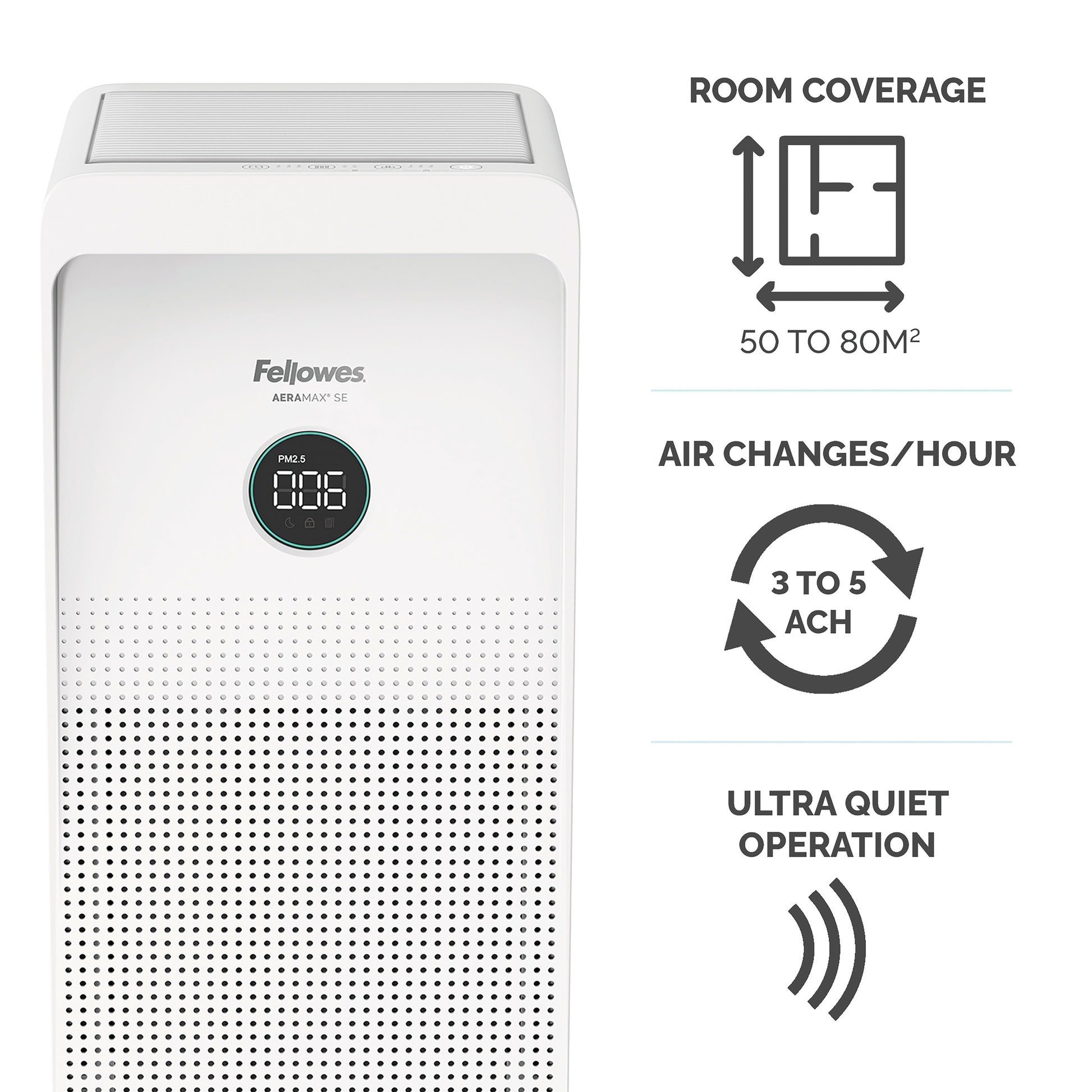 Fellowes AeraMax SE H13 HEPA Air Purifier 9799401. Captures 99.95% of airborne particles as small as 0.1 microns. AeraSmart Sensor monitors. Allergy protection with H13 HEPA Filtration. 3 speed fan with 24 hour, ultra-quiet operation.