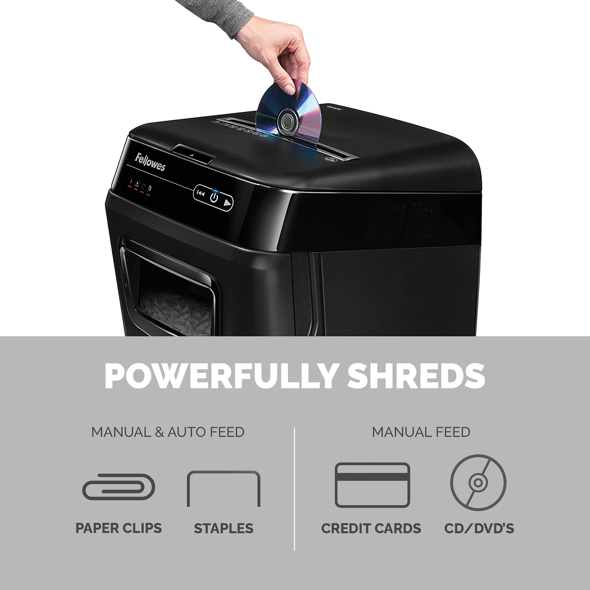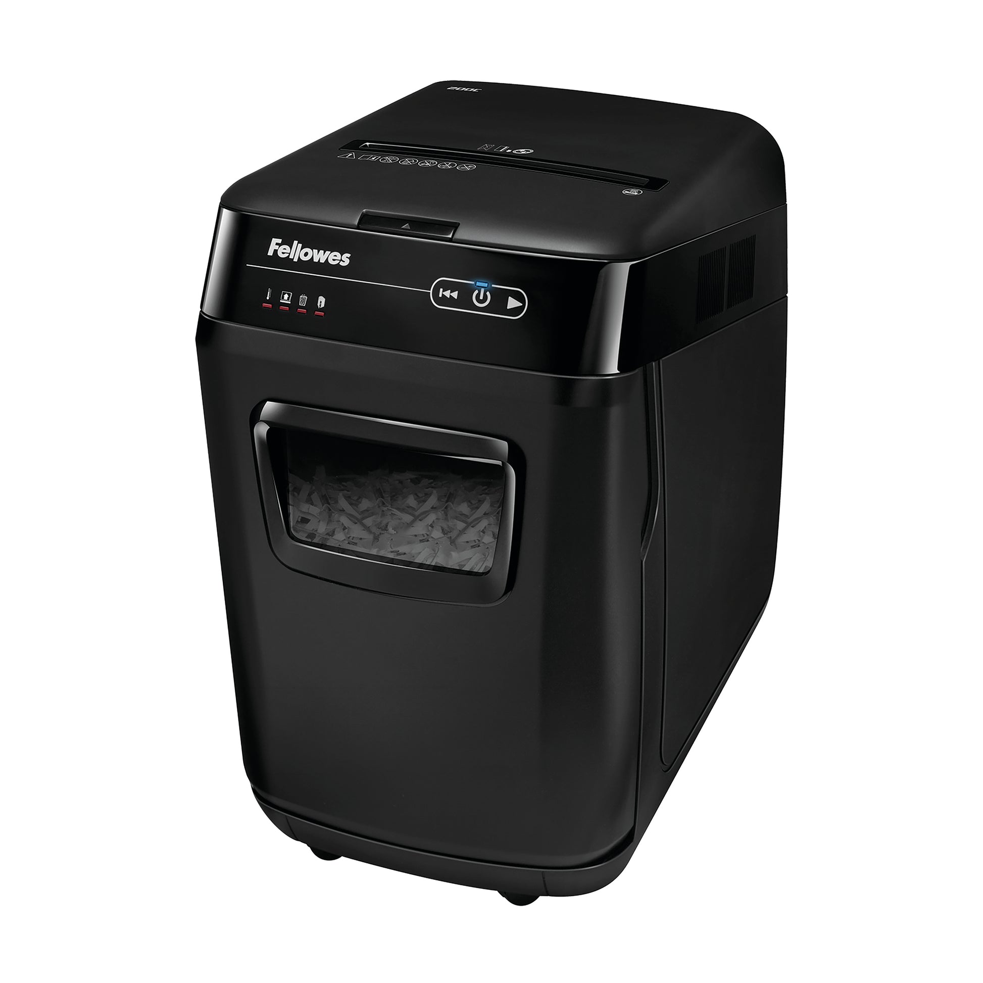 Fellowes Automax 200C Cross Square Cut Shredder. Shreds 200 pages of 70gsm A4 paper into 4x38mm particles. Security level P-4. Will also shred staples, paper clips, credit cards, CDs, DVDs and Blu Ray discs for convenience in use.