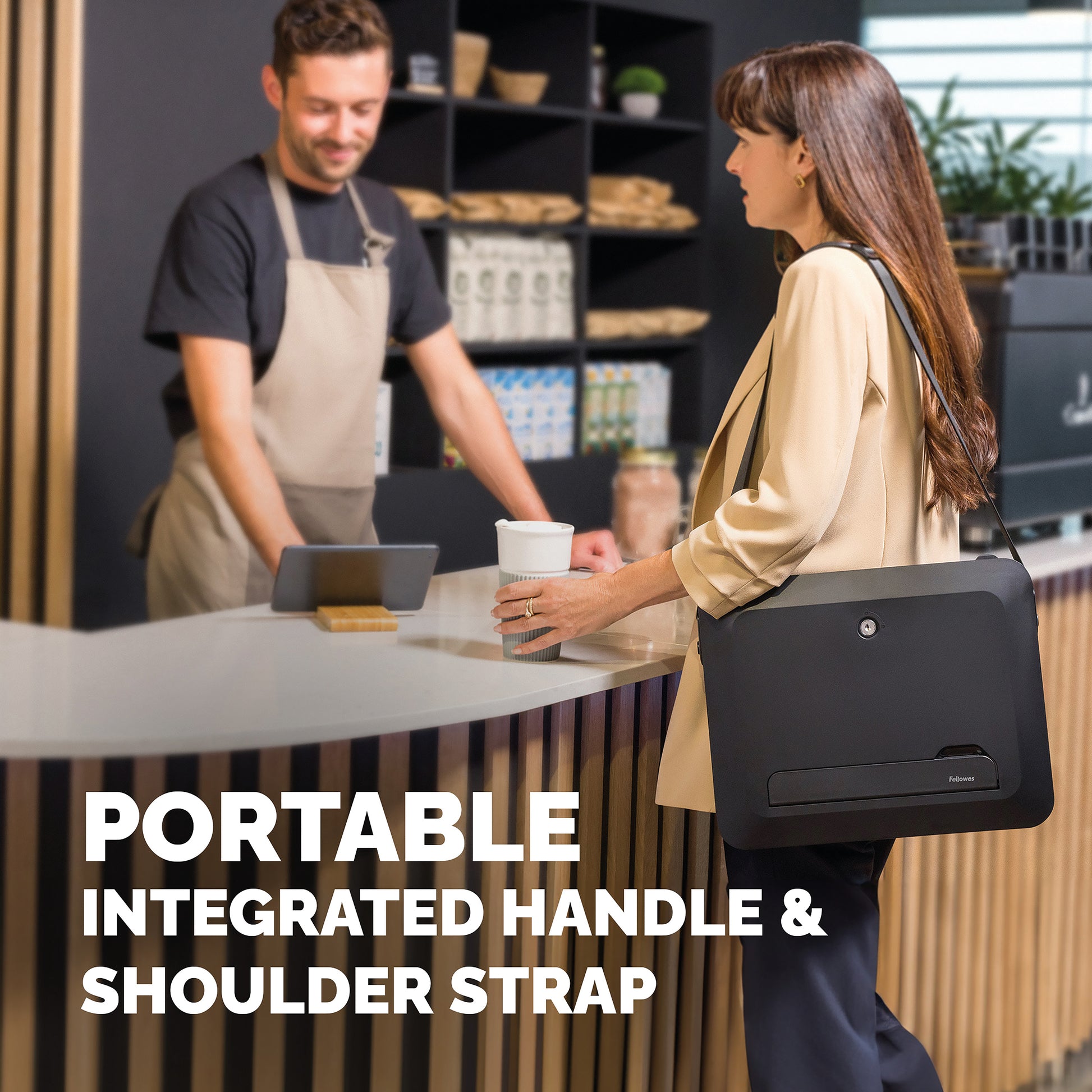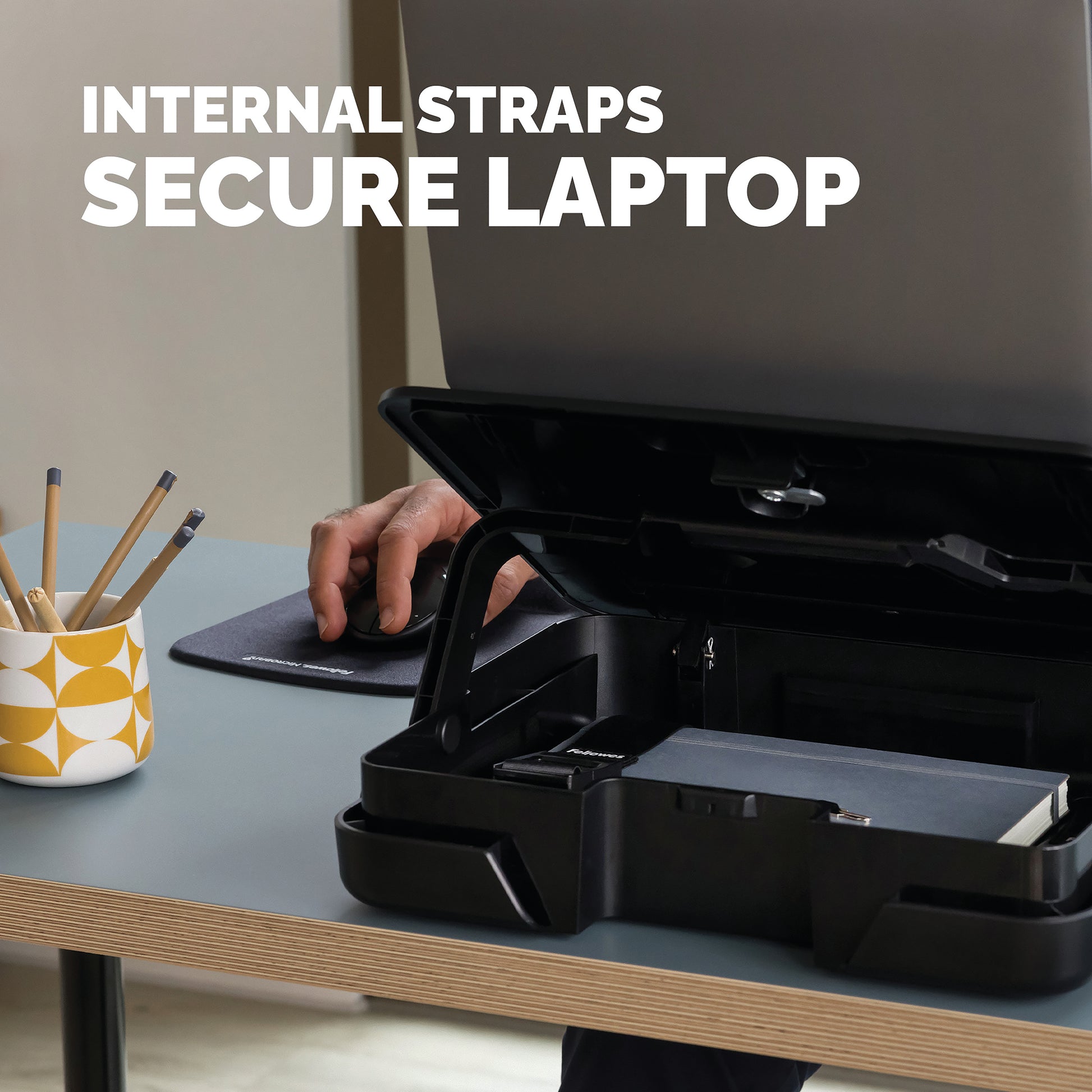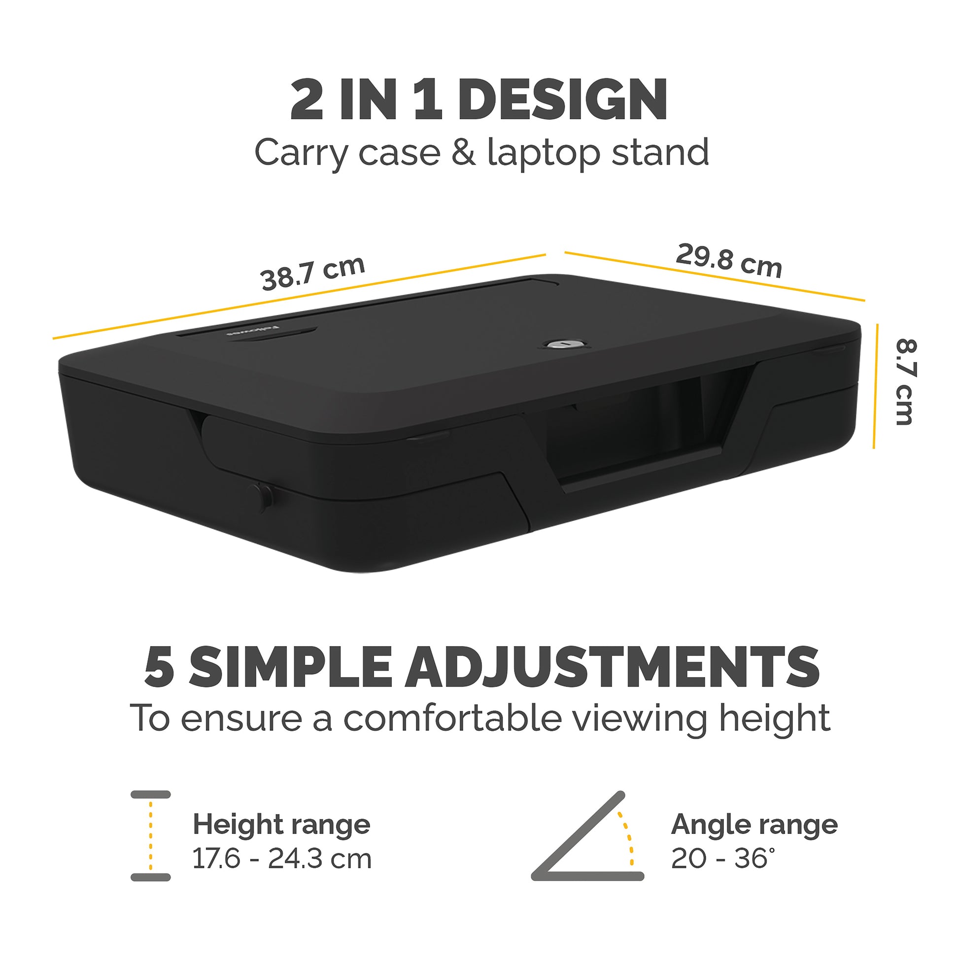Fellowes Breyta Laptop 2 in 1 Carry Case/Laptop Riser Black 100016564. Easy to set up, adjust, store away. Storage/carry case and laptop riser in one. 5 height adjustments for ergonomic laptop viewing. Includes a built-in handle and optional carry strap.