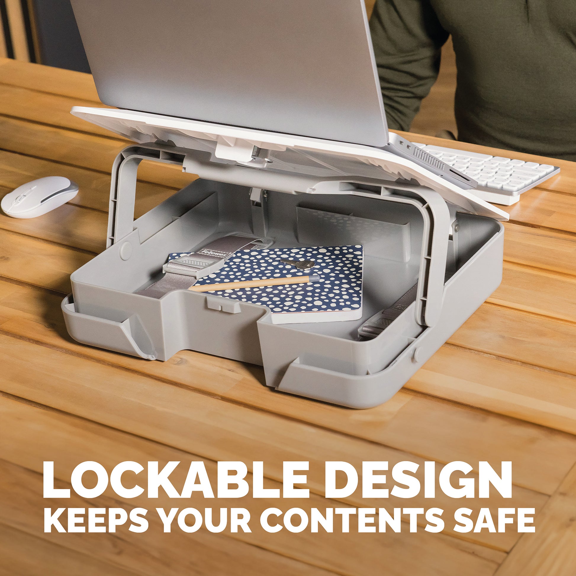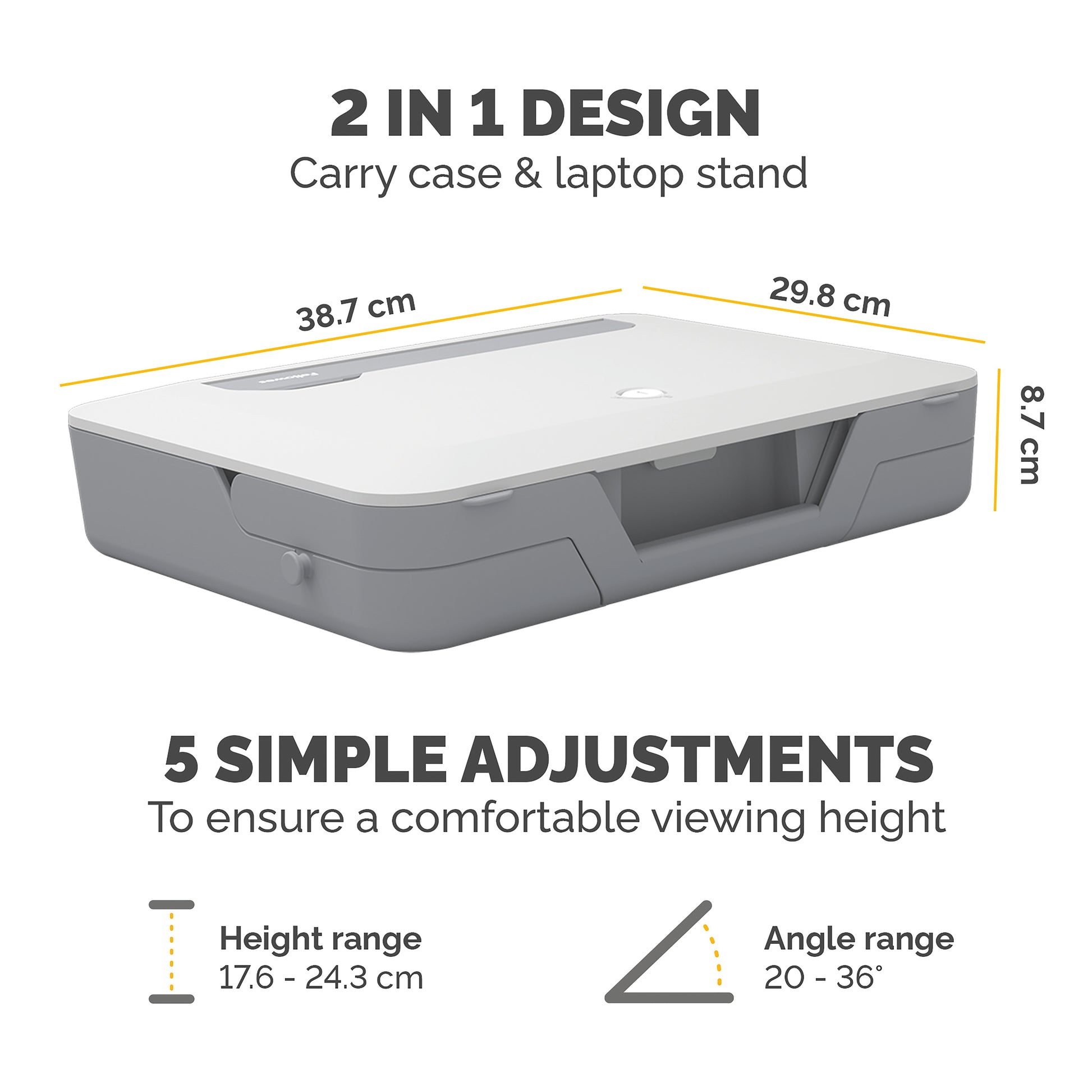 Fellowes Breyta Laptop 2 in 1 Carry Case/Laptop Riser White 100016565. Easy to set up, adjust, store away. Storage/carry case and laptop riser in one. 5 height adjustments for ergonomic laptop viewing. Includes a built-in handle and optional carry strap.